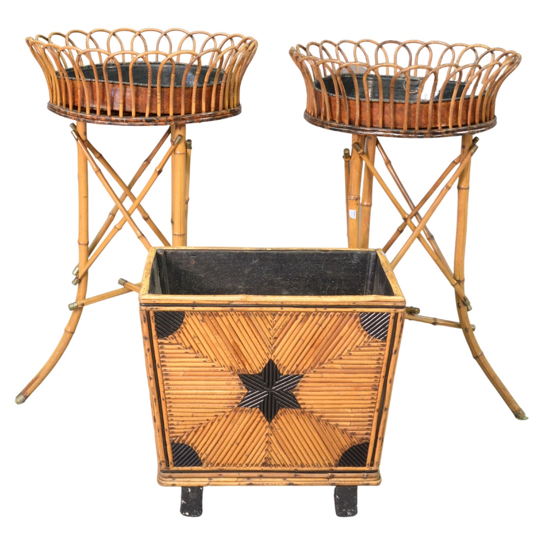 Four Piece Lot to include pair bamboo planters, with copper liners, along with small bamboo stool and wood holder, height 34 1/2 inches, diameter 21 inches.