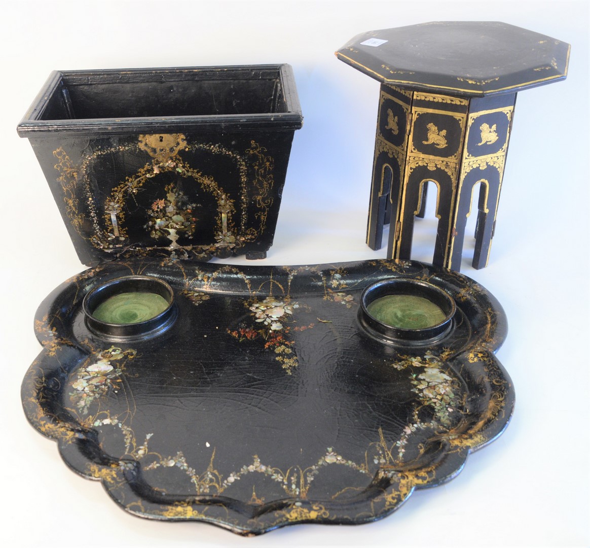 Three Piece Lot to include, papier mache tray, having black lacquer, mother of pearl, and gilt decoration, length 24 inches a small, black lacquer stand along with a box with missing cover and mother of pearl inlay.