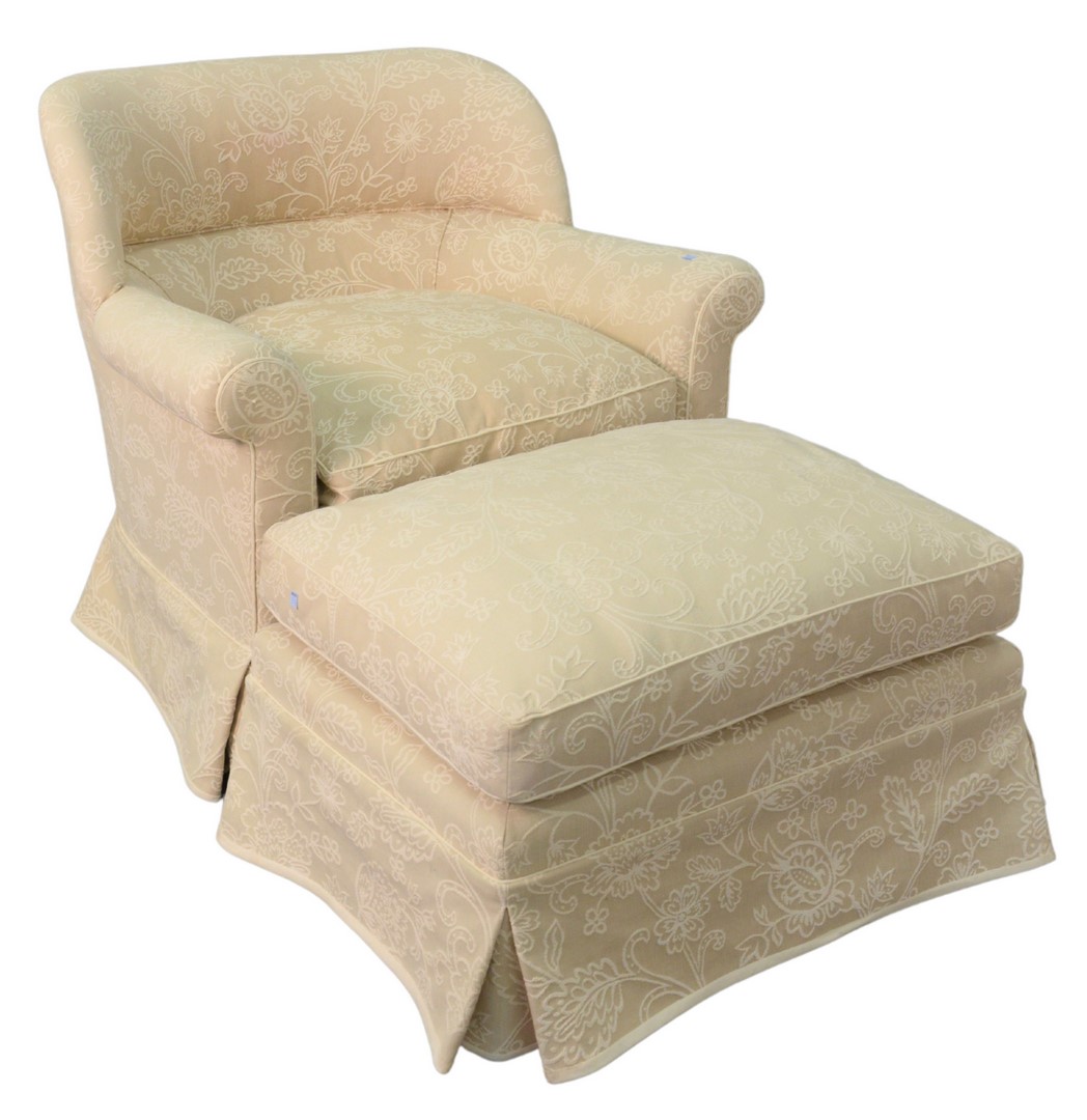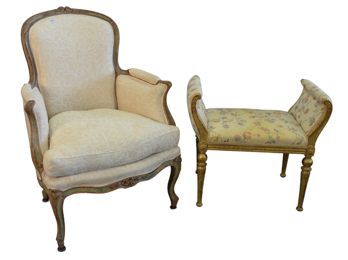 Two French Pieces, to include Louis XV style bergere in green paint, with ribbon carved frame and seat raised on foliate carved cabriole legs the padded back, arms, and seat are covered in custom tan upholstery, seat height 17 inches along with a French upholstered bench with gilt frame.