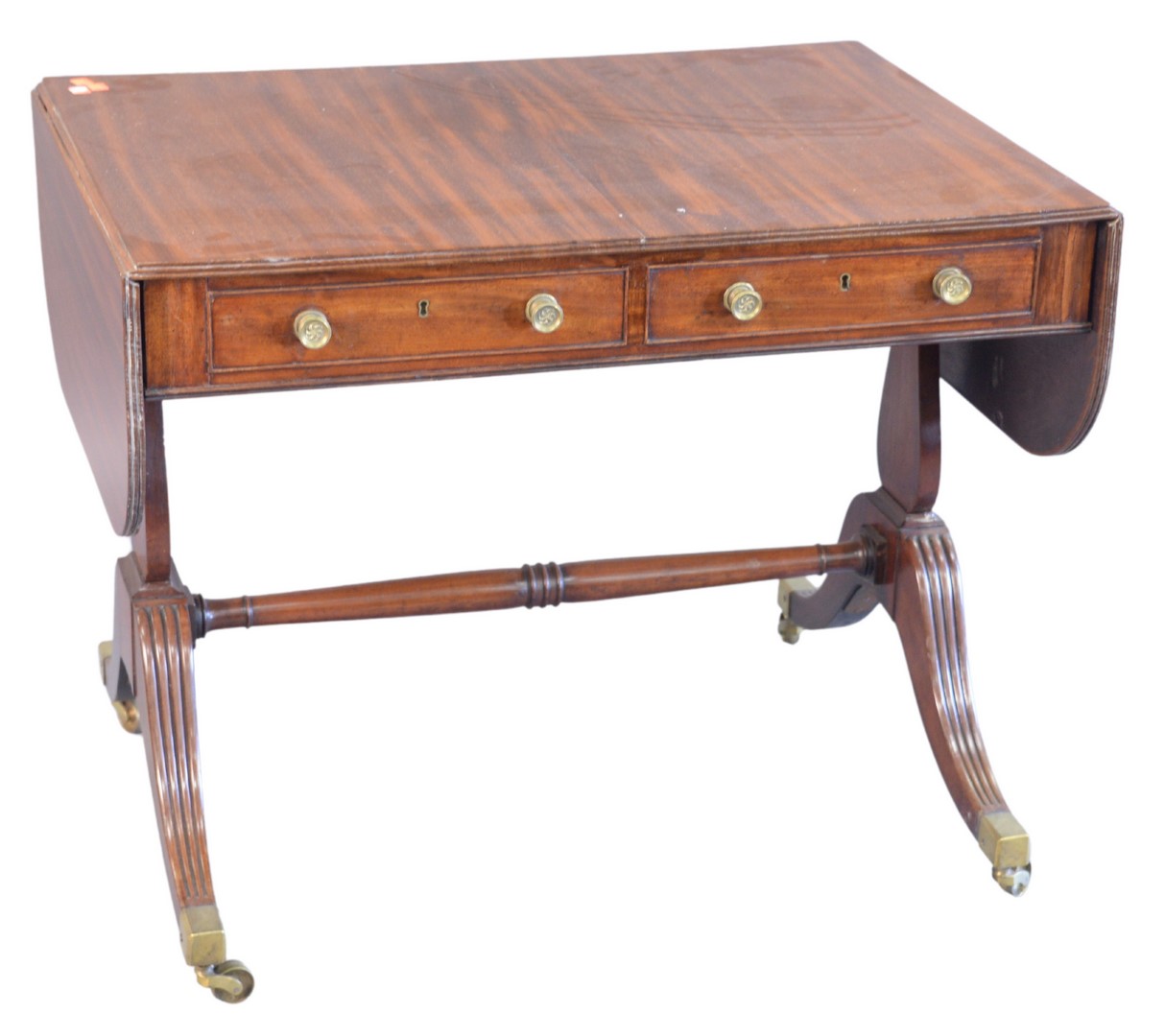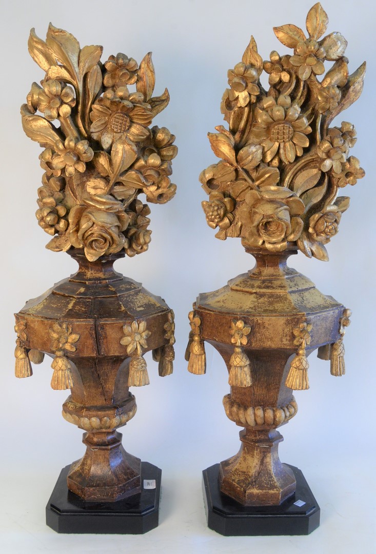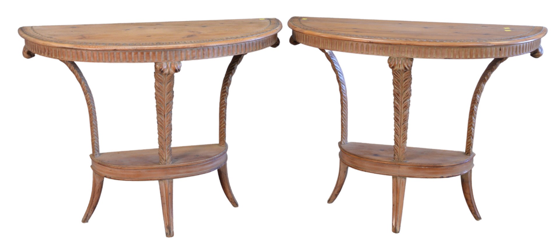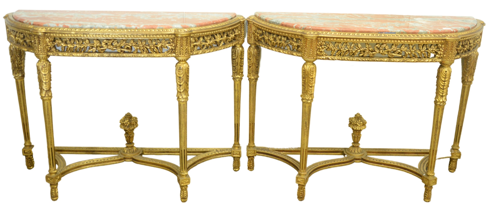 Pair of Gilt Demilune Tables, with rouge marble tops with pierce carved friezes, set on carved and fluted legs, with urn finials, marbles professionally repaired, height 37 inches, top 15 x 50.