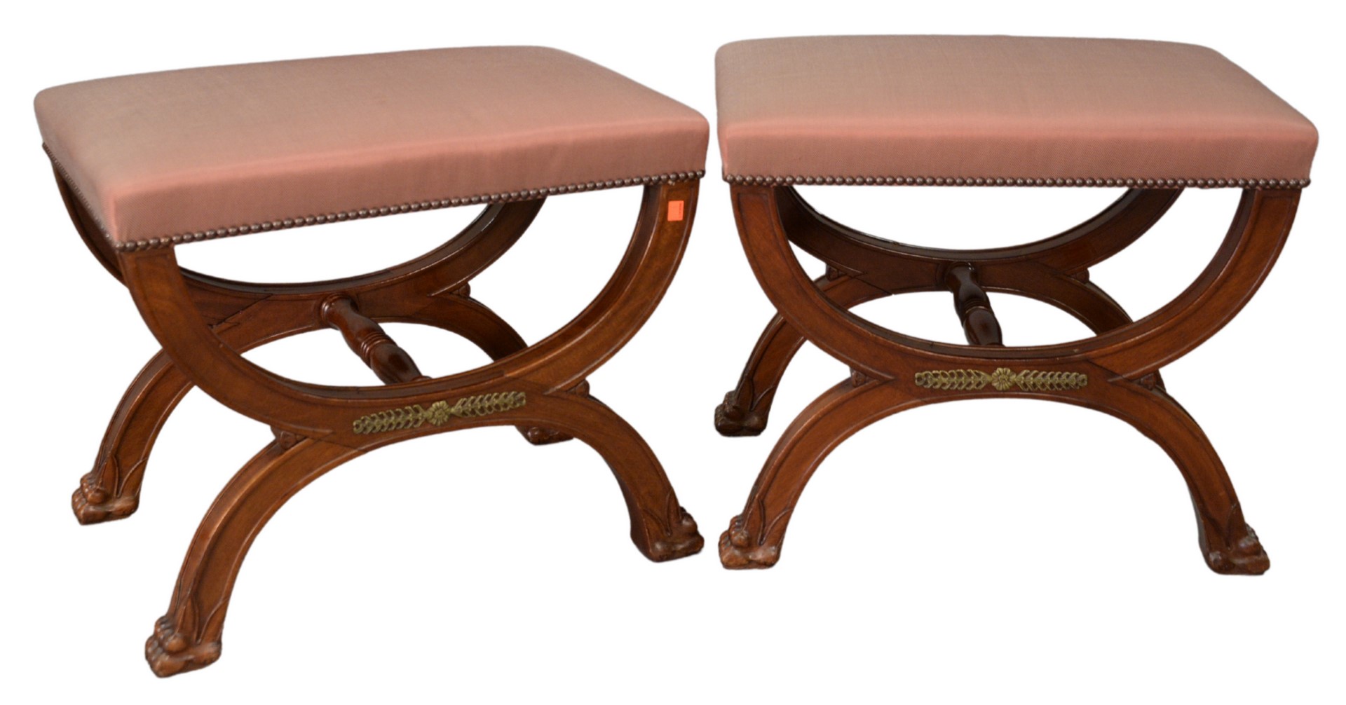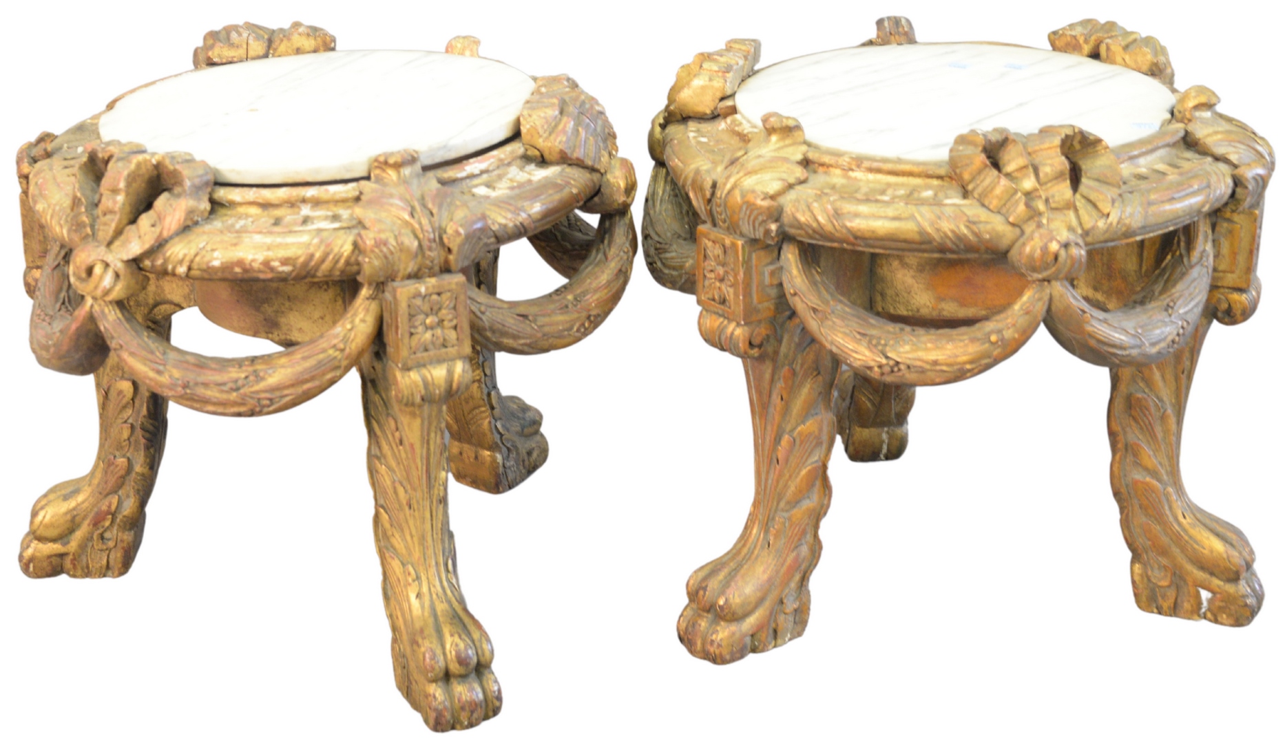 Pair of Large Louis XVI Style Carved Jardiniere Stands or Tabourets, gilt decorated with marble tops, on paw feet, height 17 inches, marble diameter 14 1/2 inches.