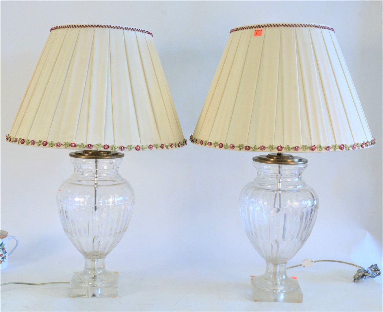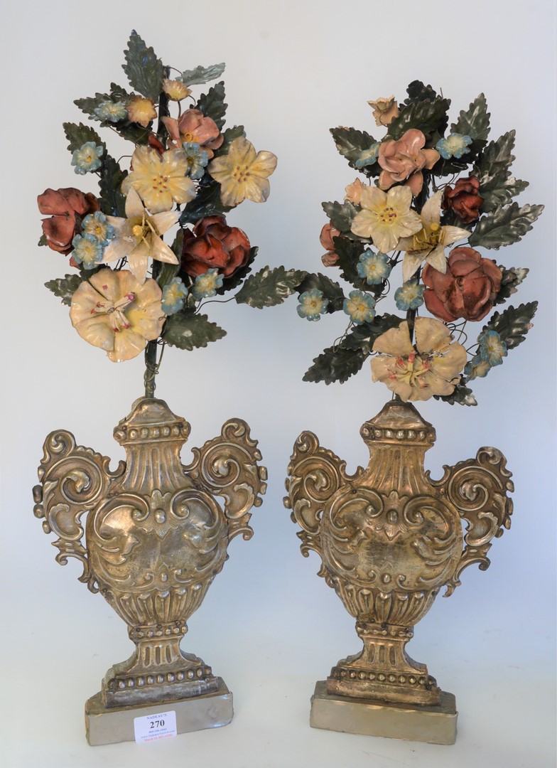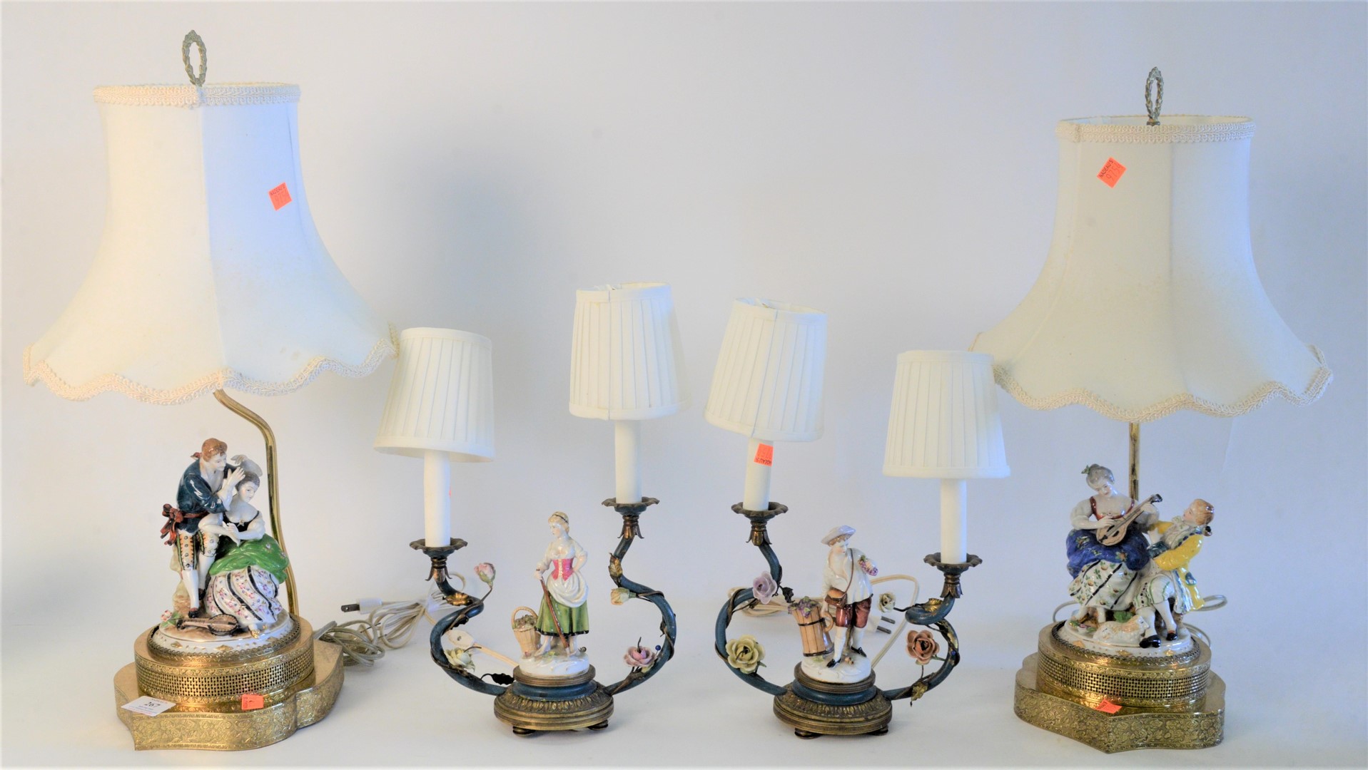 Two Pairs of Figural Table Lamps, to include pair of German porcelain figural lamps, on pierced brass bases, not marked, height 23 inches along with 19th Century German porcelain figures with two lights each, height 14 1/2 inches.