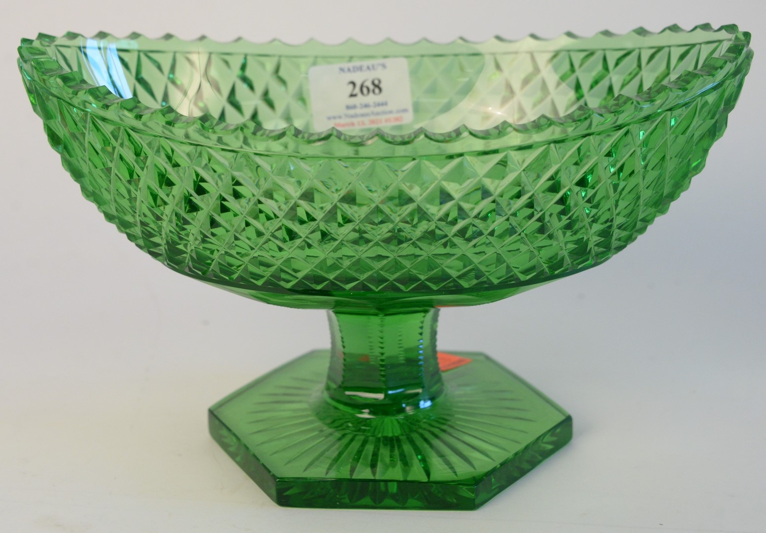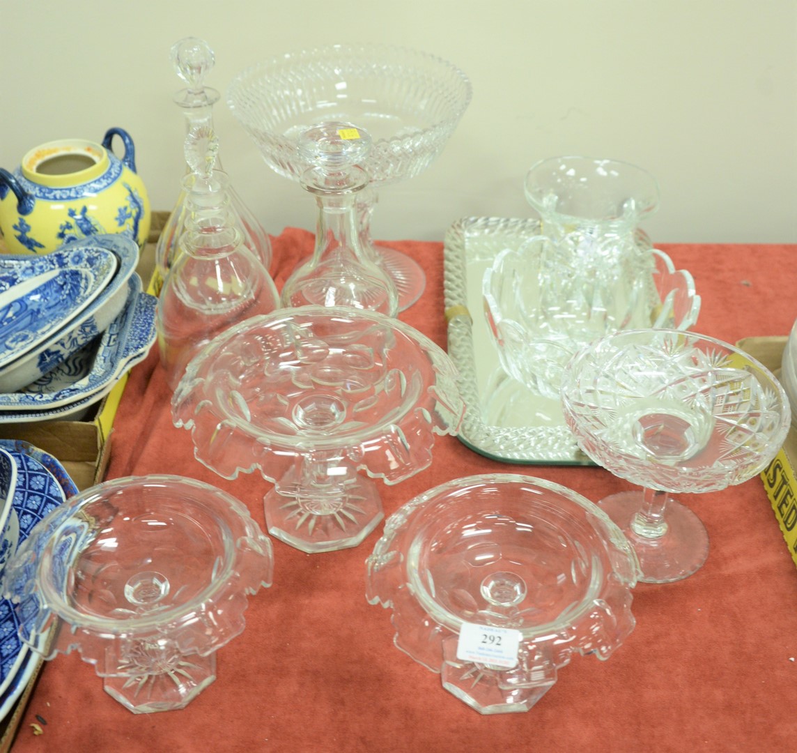 Eleven Pieces of Cut Glass and Crystal, to include glass mirrored tray with twist border set of 3 cut crystal compotes crystal bowl 3 decanters along with a large cut crystal compote.