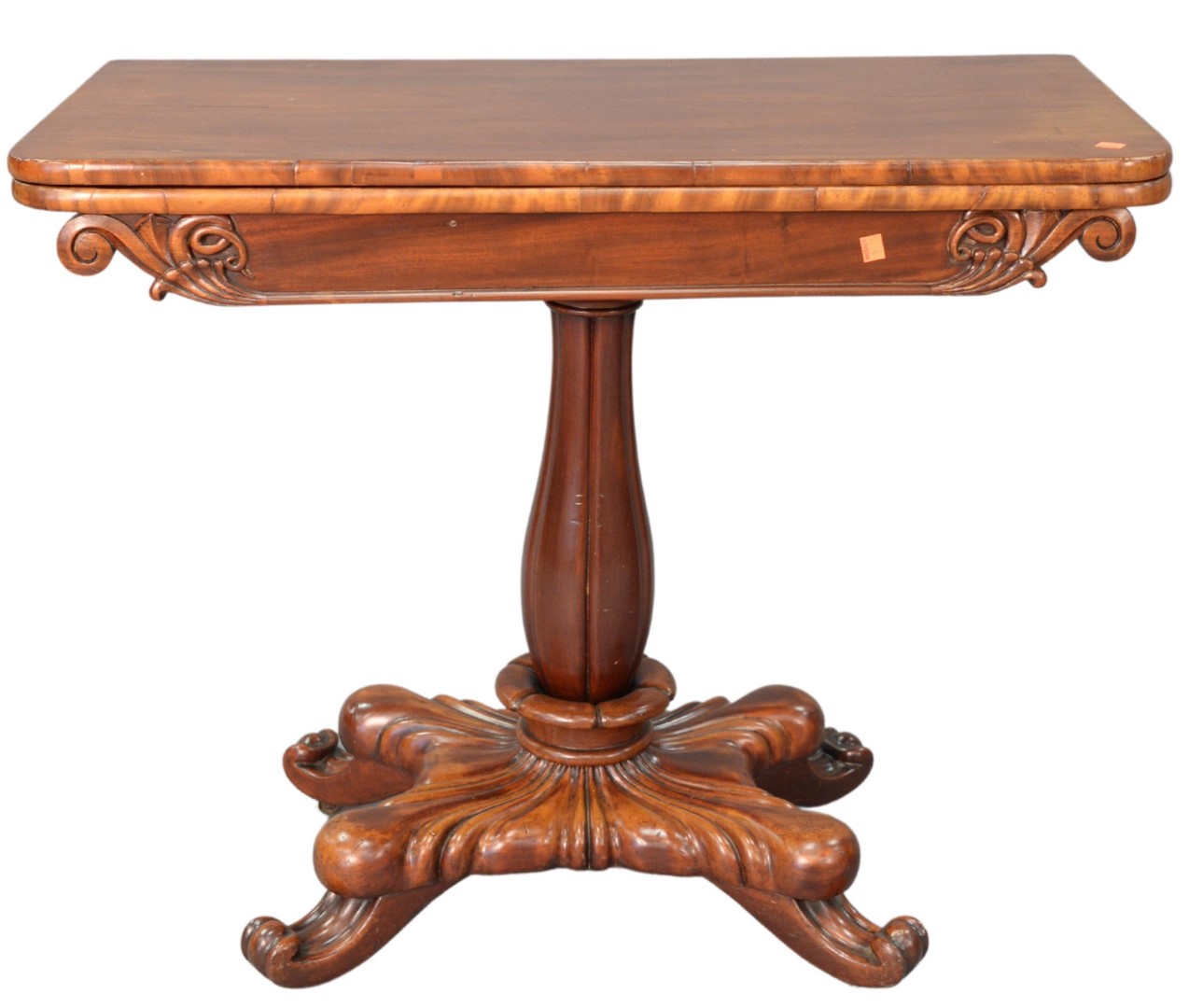 Mahogany Card Table, on pedestal with scrolled base, and felt interior. Provenance: Keith Skeel Antiques, London. Joanna Trading, London to present owner, height 29 inches, top: 18 x 36.