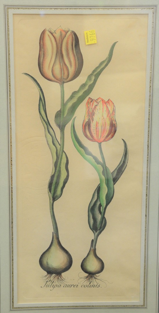 In the Manner of Basilius Besler, ‘Tulipa Aurei Coloris’, engraving on paper with hand coloring, titled in plate along the lower edge, sight size 18 x 8.