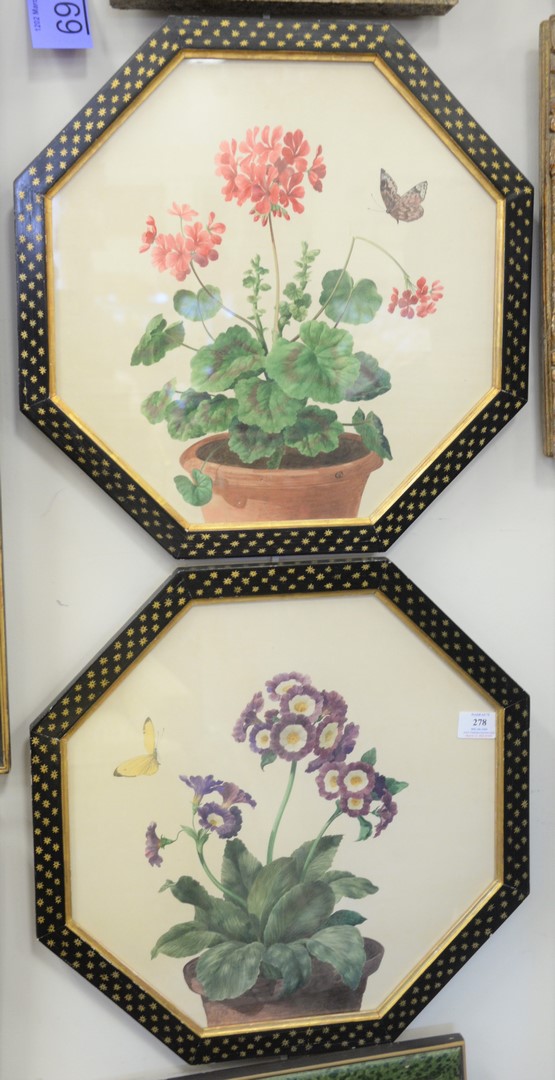 Three Framed Botanical Watercolors, to include strawberry plant with a butterfly, sight size 9 x 11, unsigned pair of blossoming flowers in pot, sight size 16 x 16 along with a flying butterfly, initialed ‘G’ in a circle.