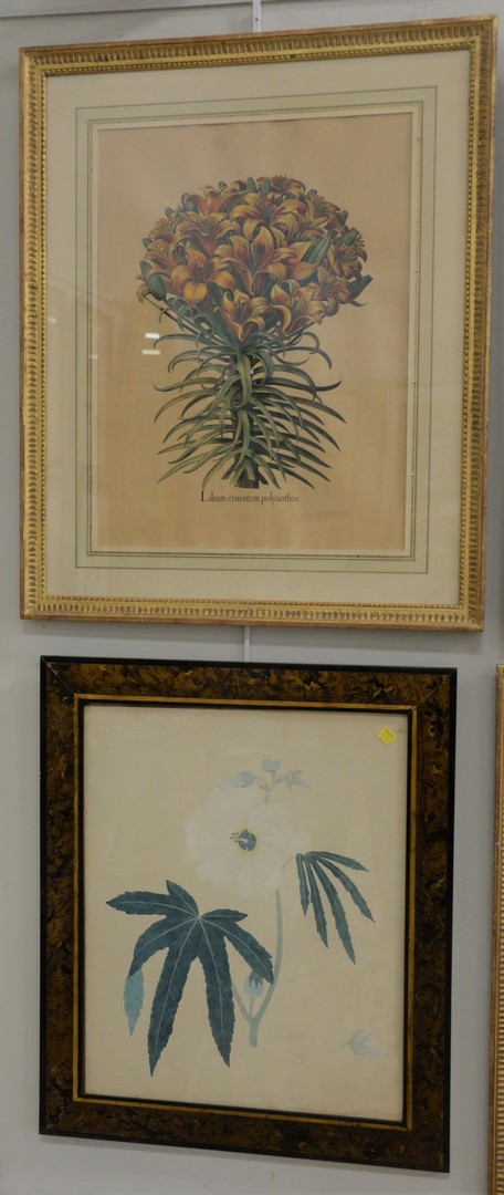 Seven Framed Botanical Engraving Lithographs, Cinera Cum Flore, Lilium Cruentum Polyanthos, Flos Solis Prolifer, two botanical prints, two botanical floral engravings, hand colored, largest sight size 22 x 16 1/2.