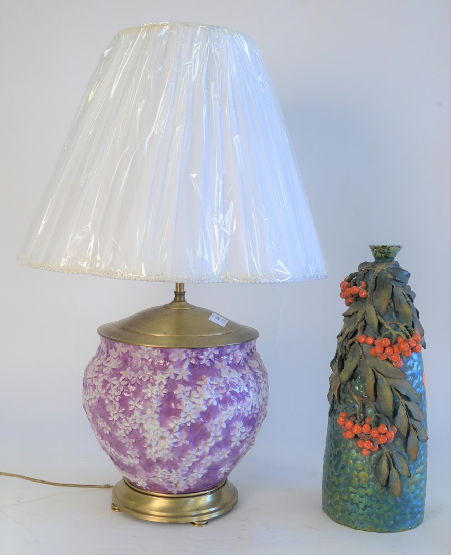 Two Vases Attributed to Zsolnay green iridescent glazed vase with molded leaves and berries, drill bottom, ground top rim along with a lilac cachepot made into a table lamp tallest height 28 inches.