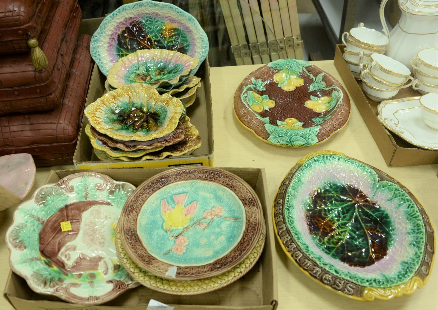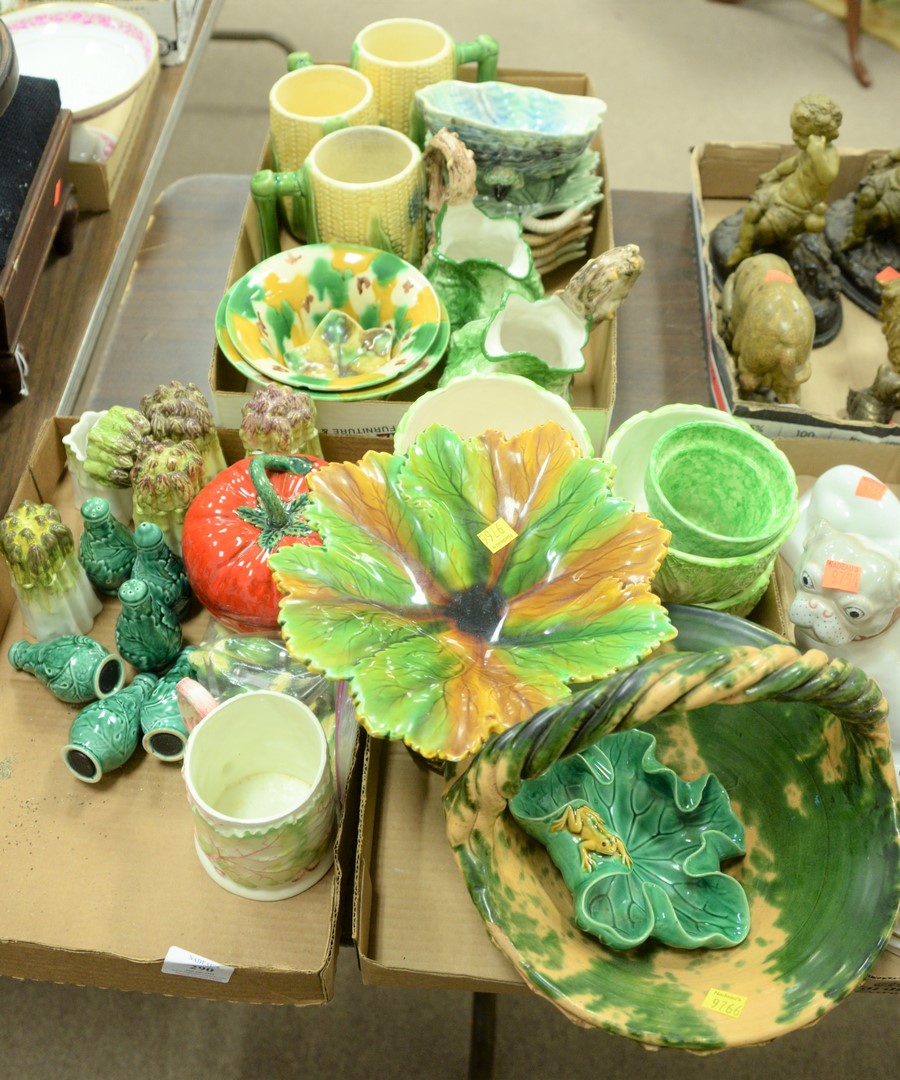 Three Tray Lots of Majolica and Glazed Ceramics, to include cabbage bowls, corn mugs, cabbage creams, a shell dish with muscle feet, along with five leaf plates and several other pieces.