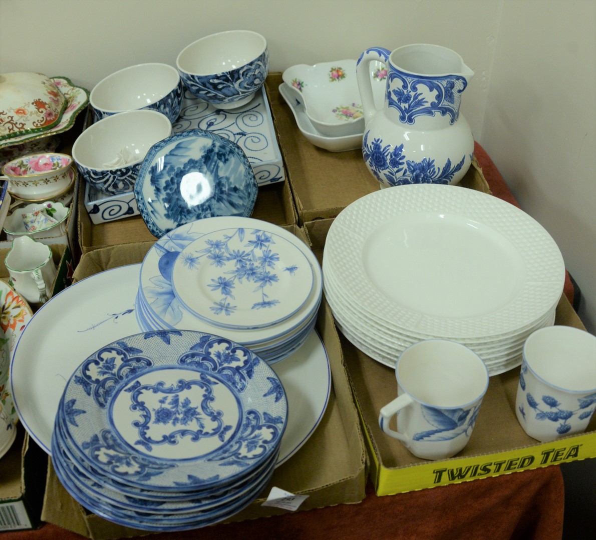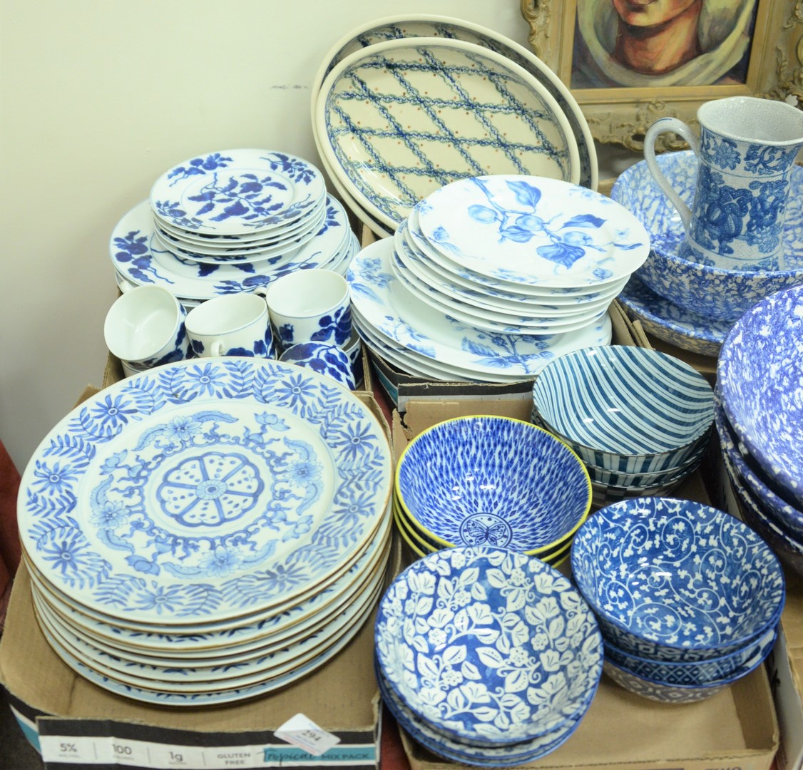 Four Box Lots, to include 8 blue and white Chinese porcelain plates 12 blue and white bowls Fitz and Floyd Blue Indigo tea cups dessert plates dinner plates along with Williams Sonoma Ormonde salad and dinner plates.