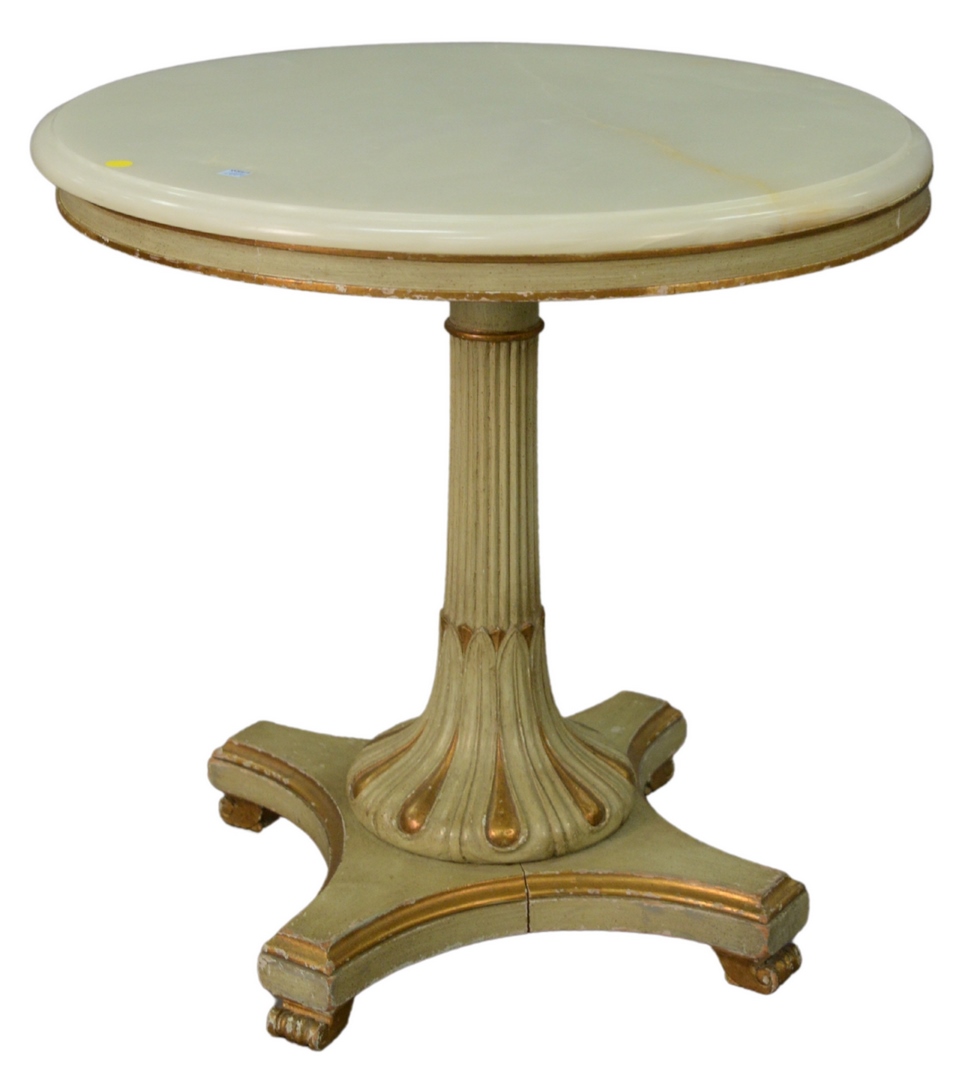 Onyx Top Round Table, on carved, green and gold decorated pedestal base, height 25 inches, diameter 27 inches. Provenance: The Estate of Alina Roisen, Park Avenue, New York.