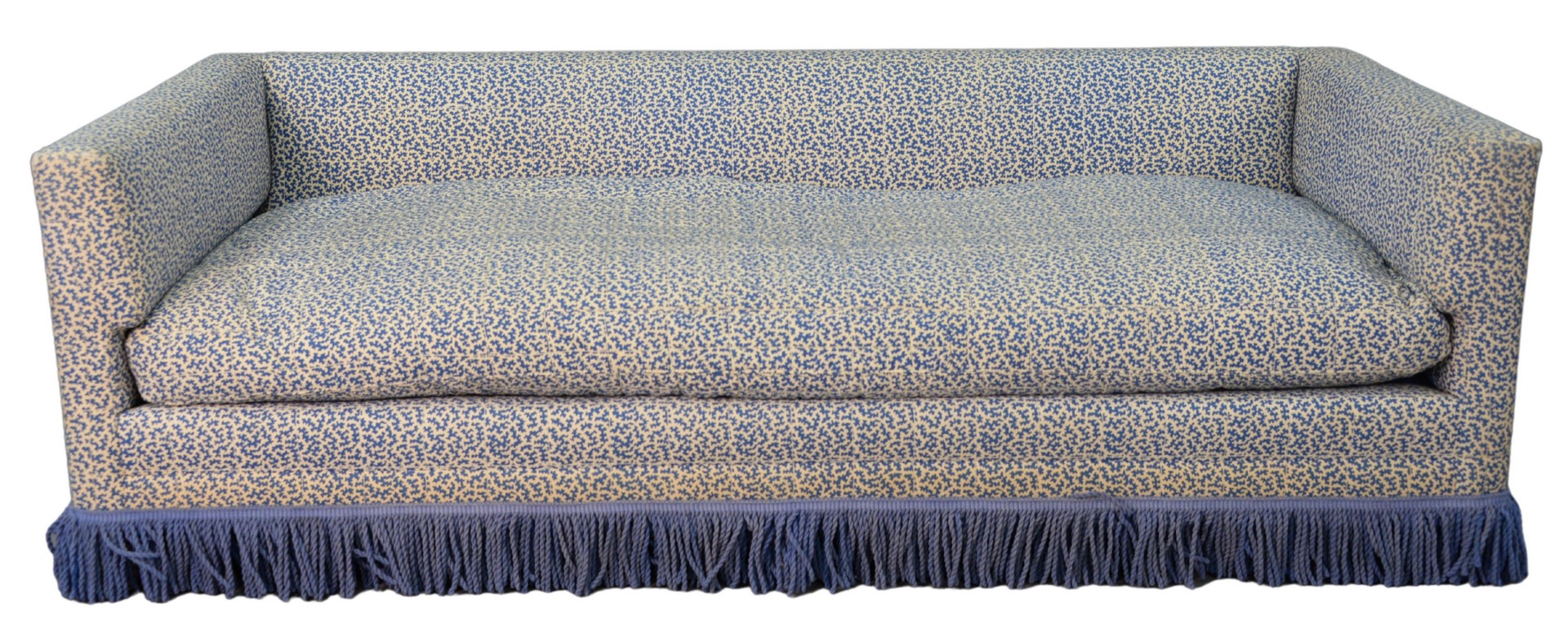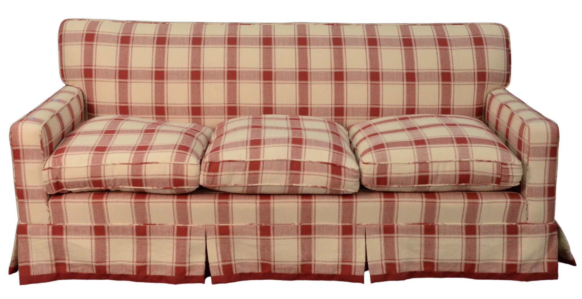 Albert Menin Interiors Plaid Custom Upholstered Sofa, height 32 inches, length 72 inches along with a king headboard, height 49 inches, width 78 inches.