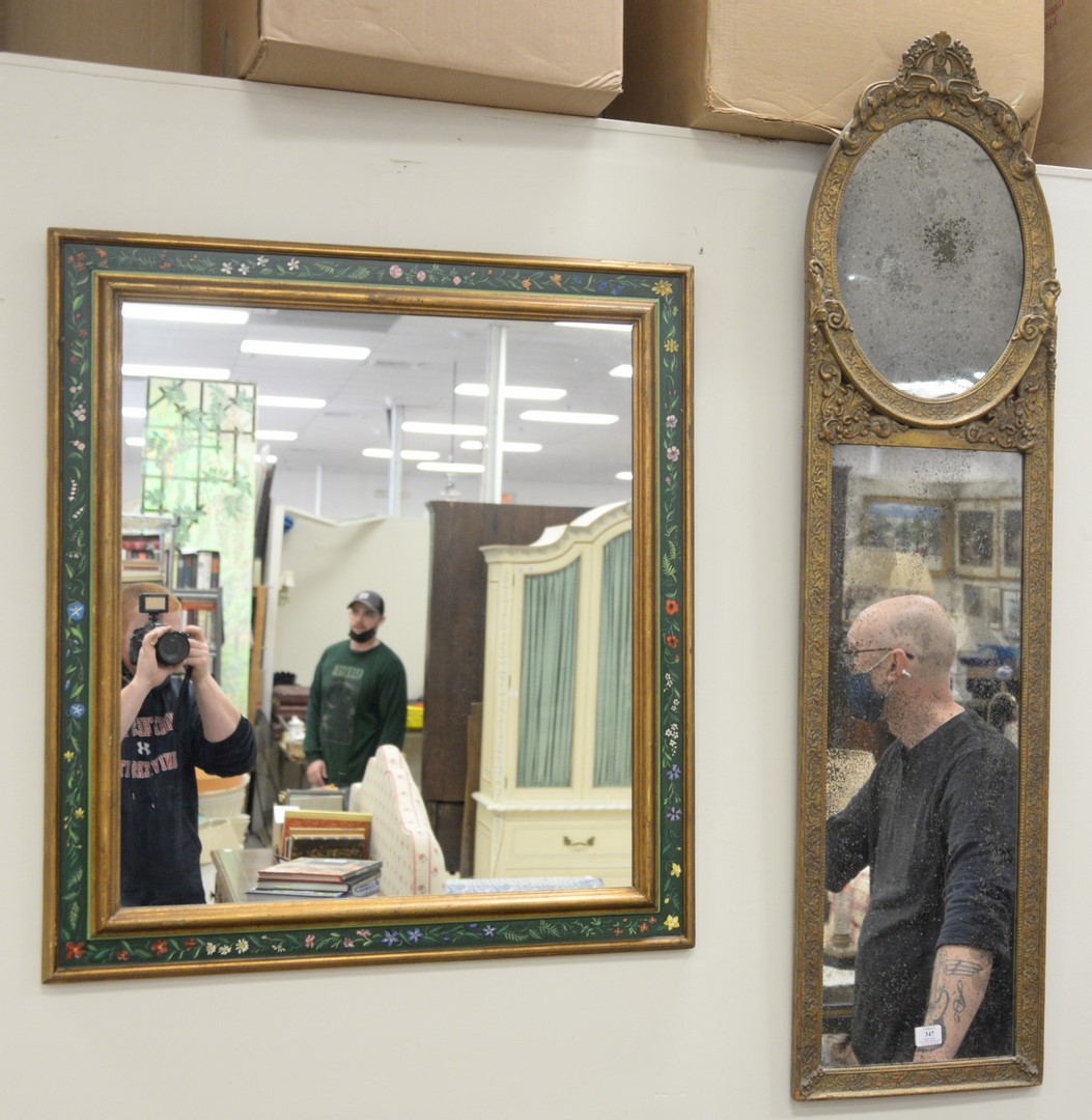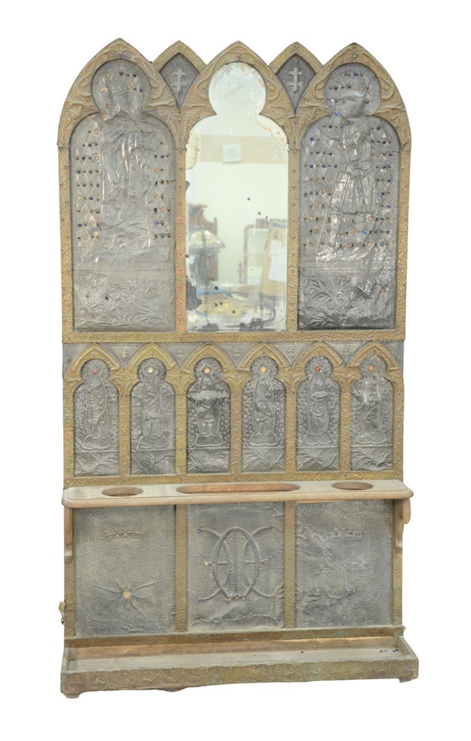 Gothic Hall Rack, having embossed brass and embossed pewter figures, King Arthur & Knights mounted with various colored glass beads and mirror center several cubed glass beads missing, height 79 inches, width 43 inches. Provenance: Former home of Mel Gibson, Old Mill Rd, Greenwich, Connecticut.