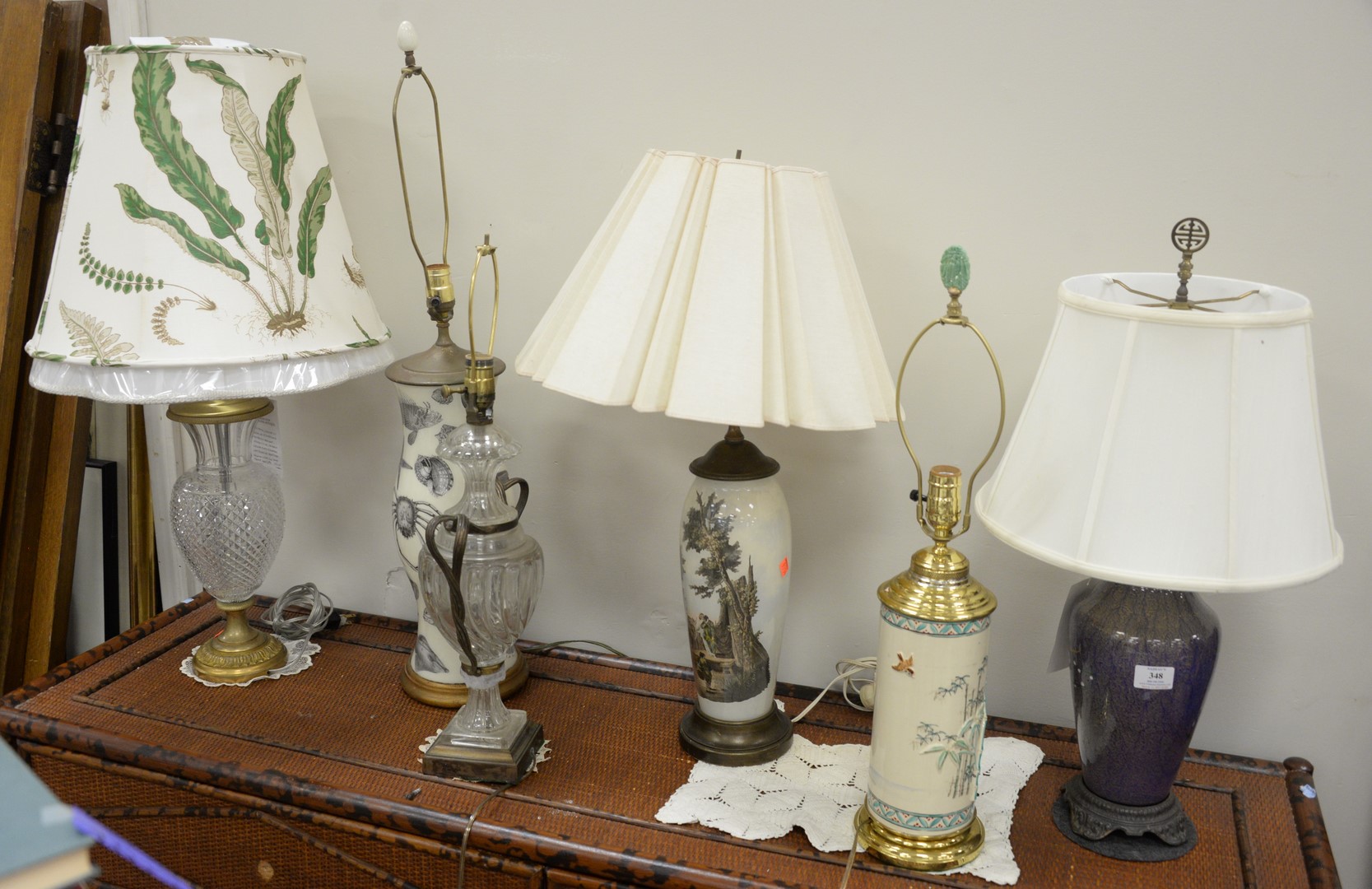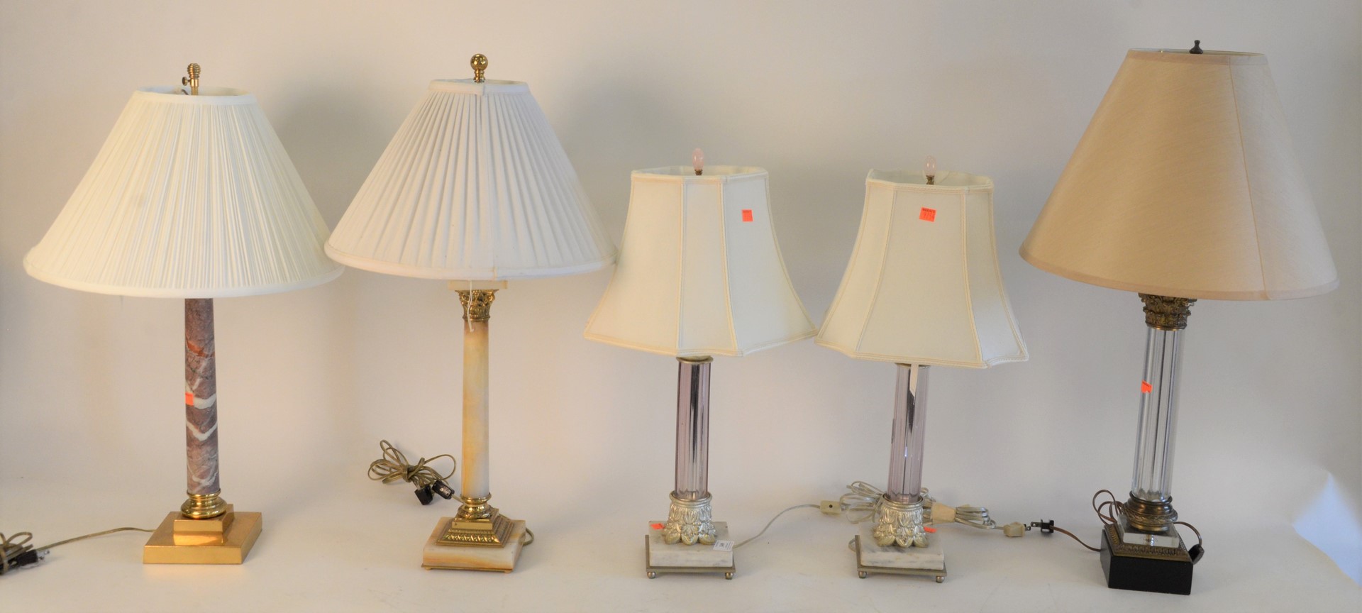 Five Piece Group of Decorative Table Lamps, to include three glass, cylindrical lamps, along with two marble, cylindrical lamps, tallest height 27 inches.