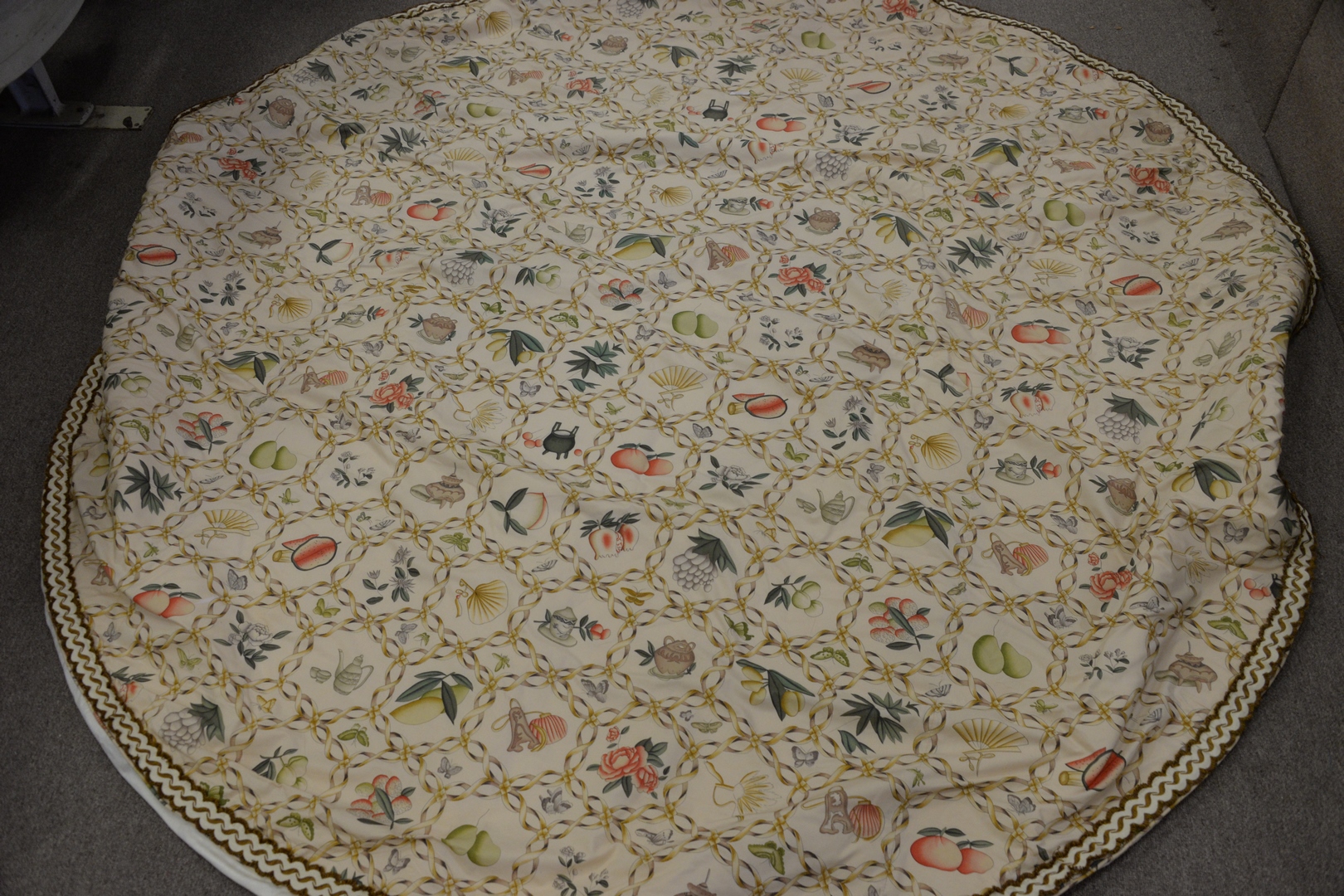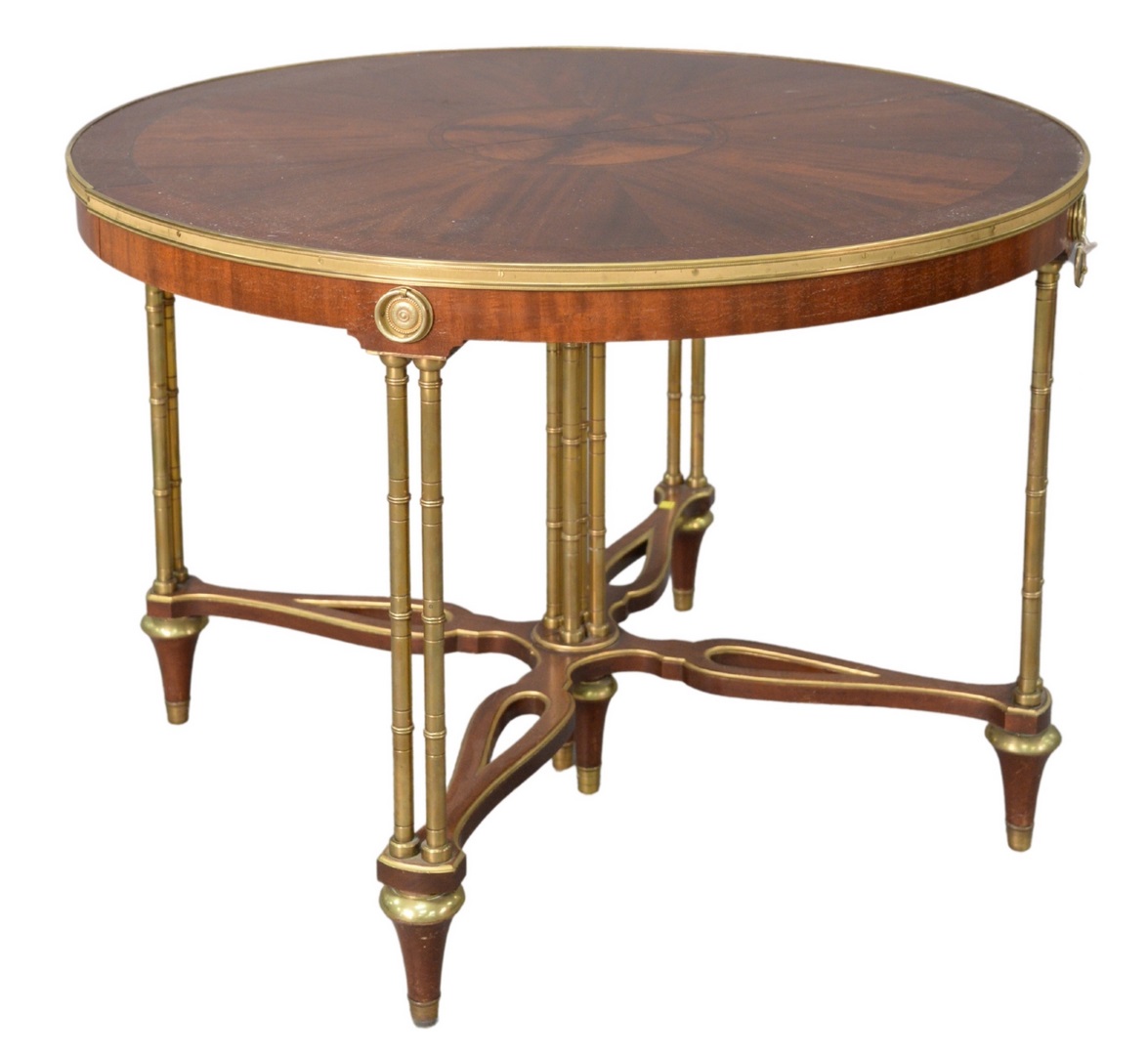 Continental Style Round Table, in the manner of Jansen, trimmed in brass, set on brass bamboo turned legs, with open stretchers, height 29 1/2 inches, diameter 42 inches, two extra leaves, 20 inches each, open 42 x 82.