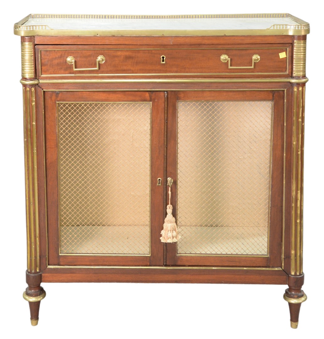 Louis XVI Cabinet, with brass trimmed marble top, over drawer, over two grill work drawers, set on turned legs, 18th Century, height 40 1/2 inches, width 38 inches, depth 15 inches.