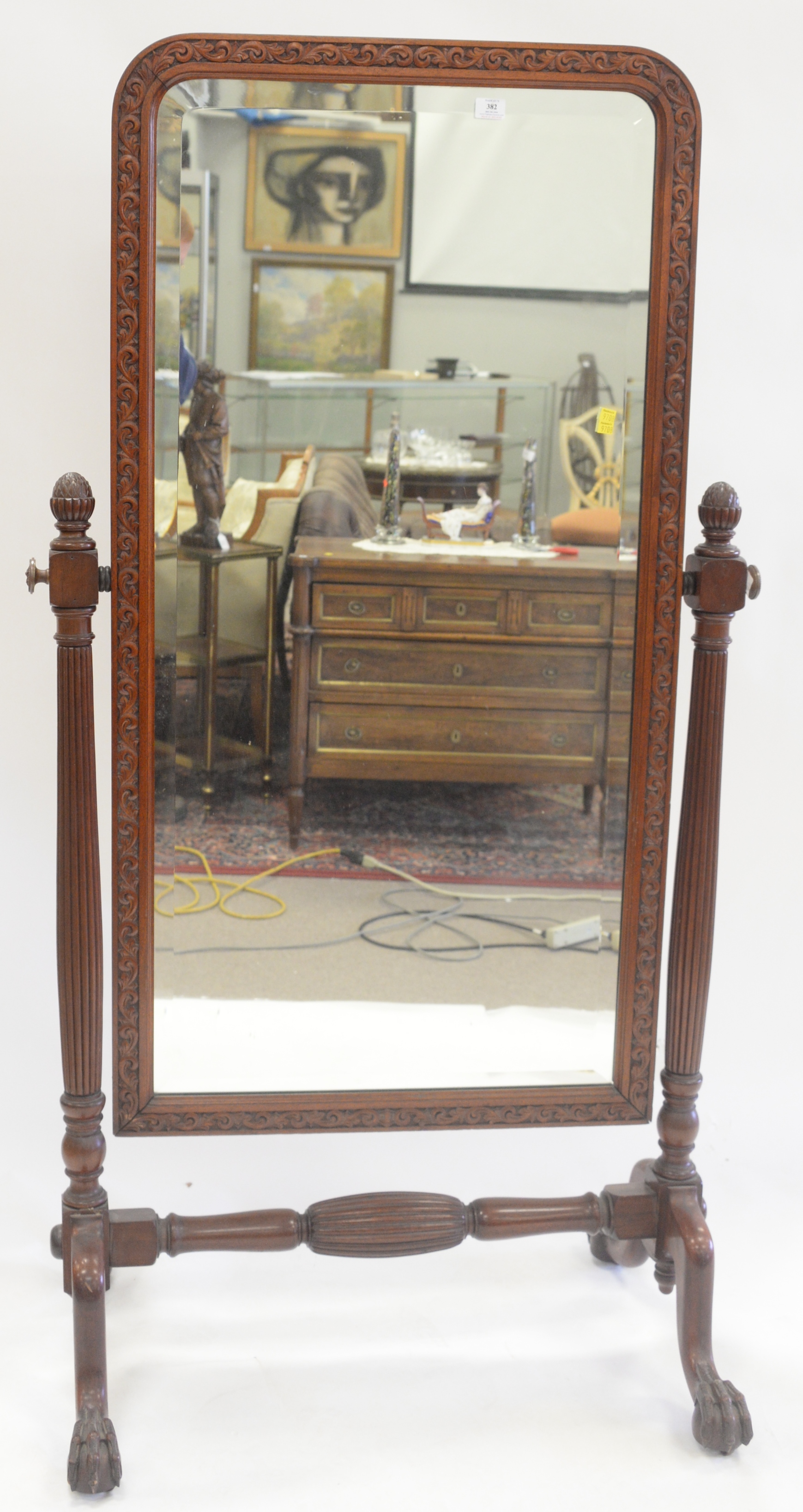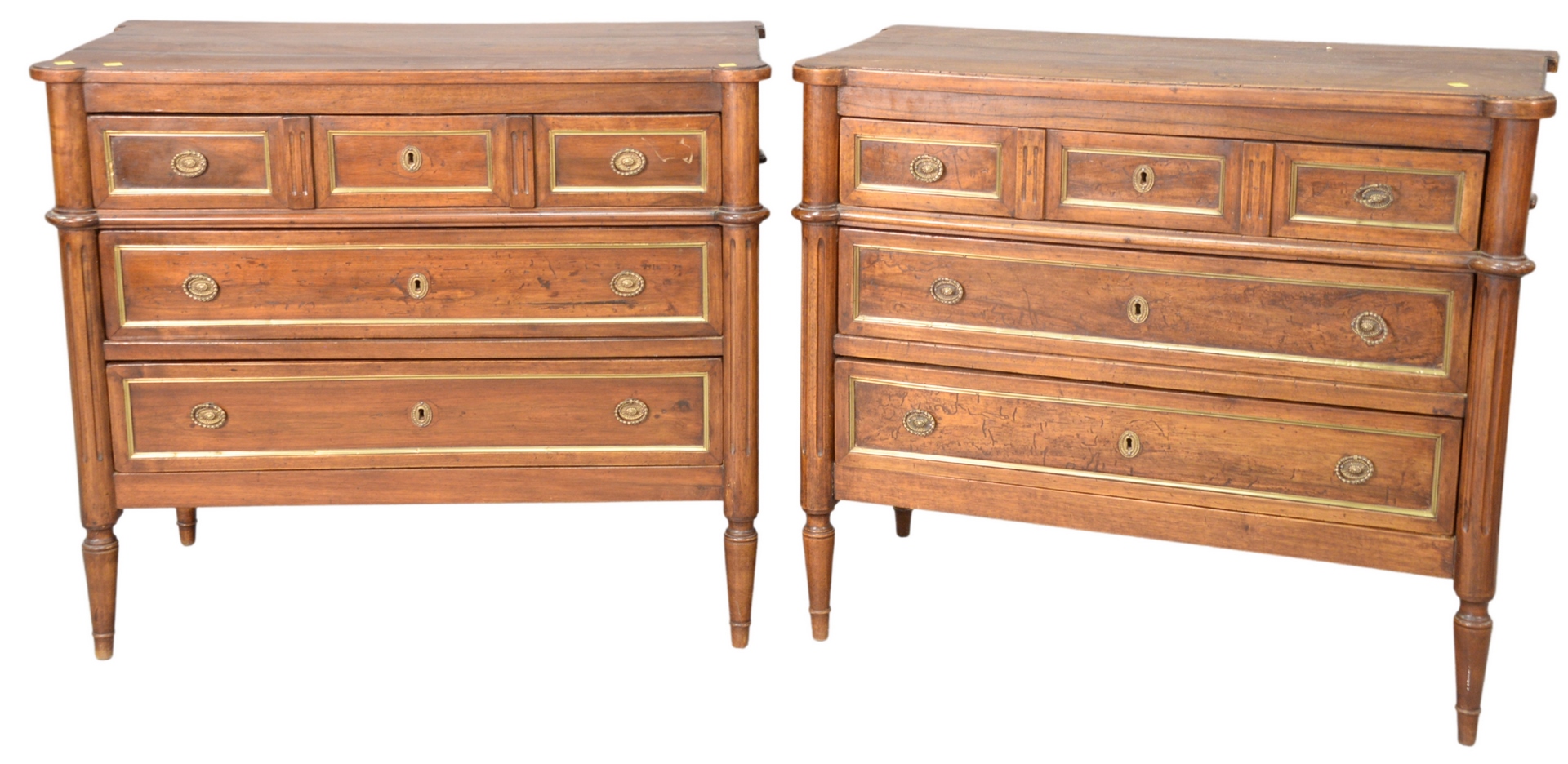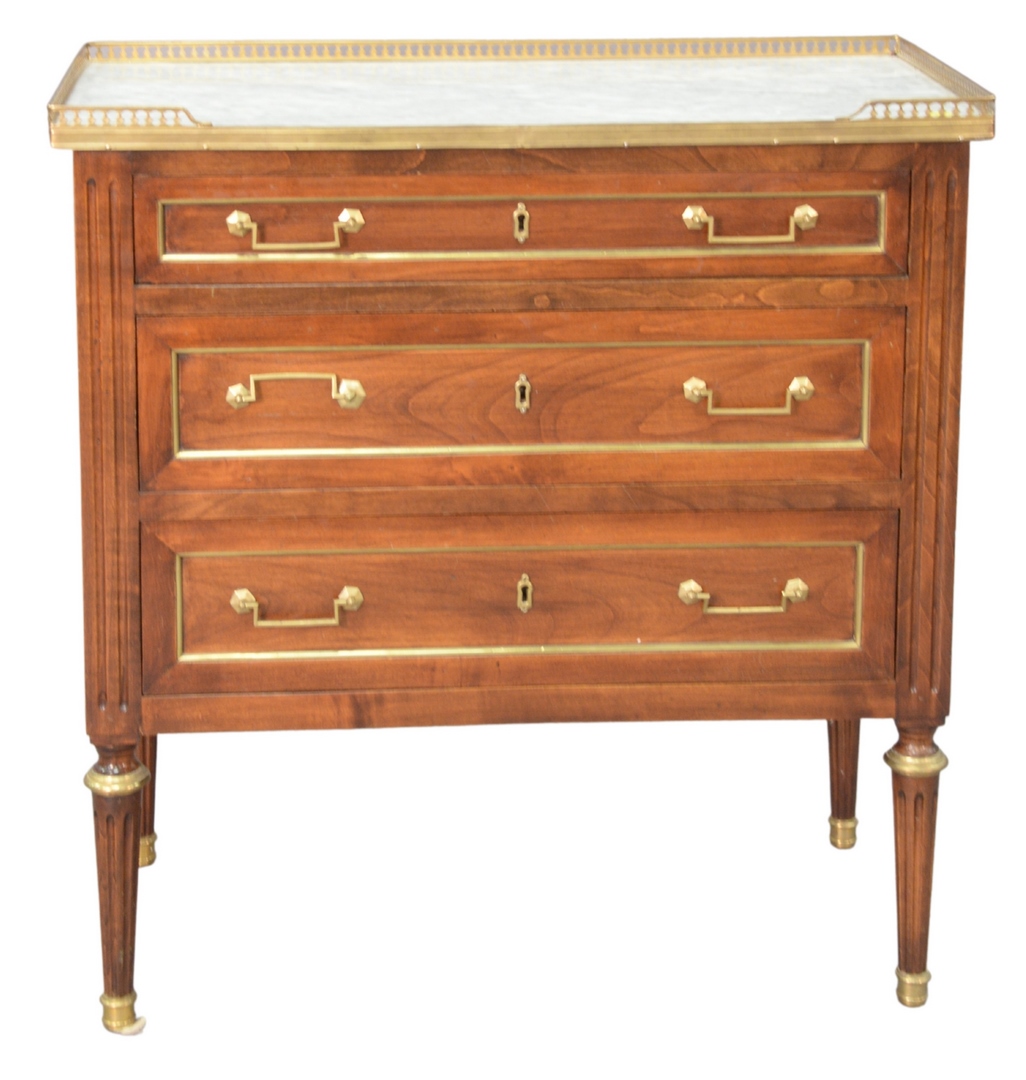 Louis XVI Style Mahogany Commode, with marble top, brass trimmed, set on fluted legs with brass trim, in the manner of Jansen, height 33 1/2 inches, top 16 x 31 1/2.