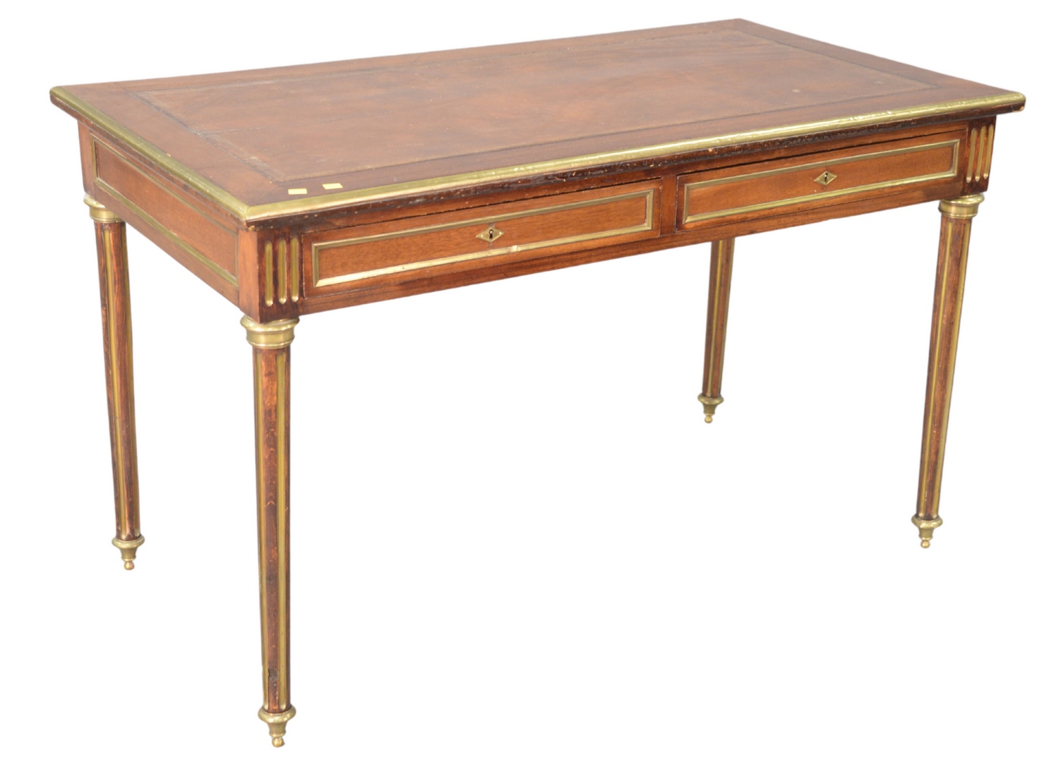 Louis XVI Style Table, with brass gallery and marble top, with two drawers, and two candle slides, probably 19th Century, height 30 inches, diameter 25 3/4 inches.