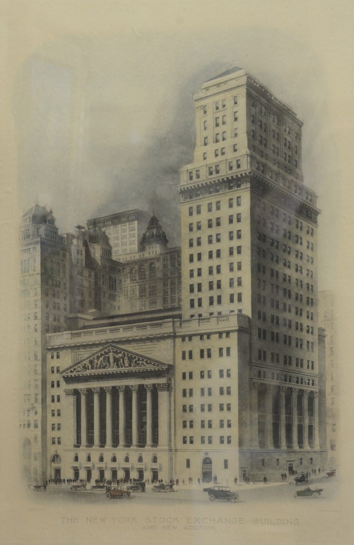 Two Piece Lot, to include Sidney Lucas and Roger Varin Wall Street in 1836, hand colored etching on paper, signed in pencil by Roger Varin, along with The New York Stock Exchange Building and New Addition, engraving on paper, largest sight size 29 x 21.