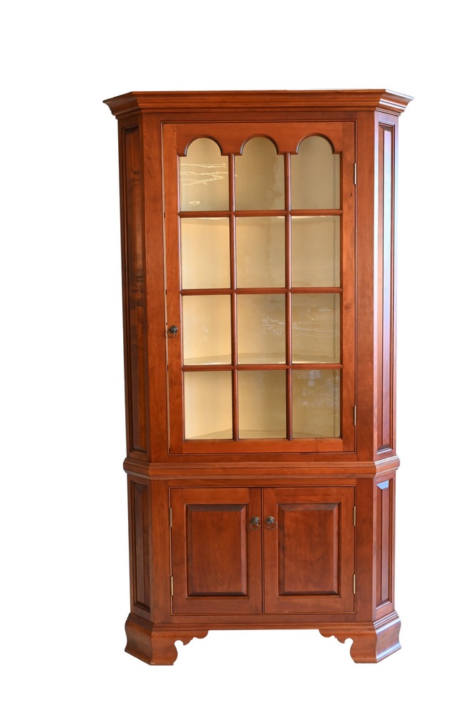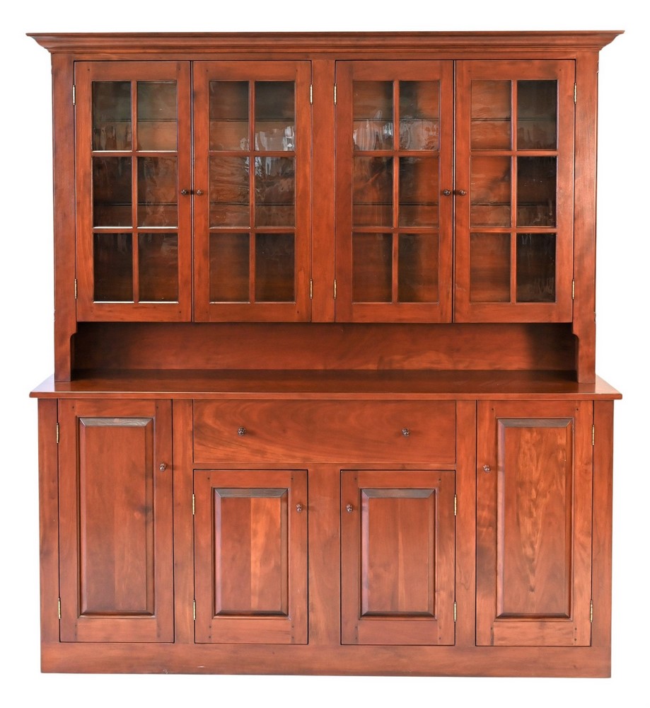 D.R. Dimes Cherry Stepback Cabinet in Two Parts, upper section having four glass doors, on lower cabinet a drawer and four doors, height 79 inches, width 72 1/4 inches.