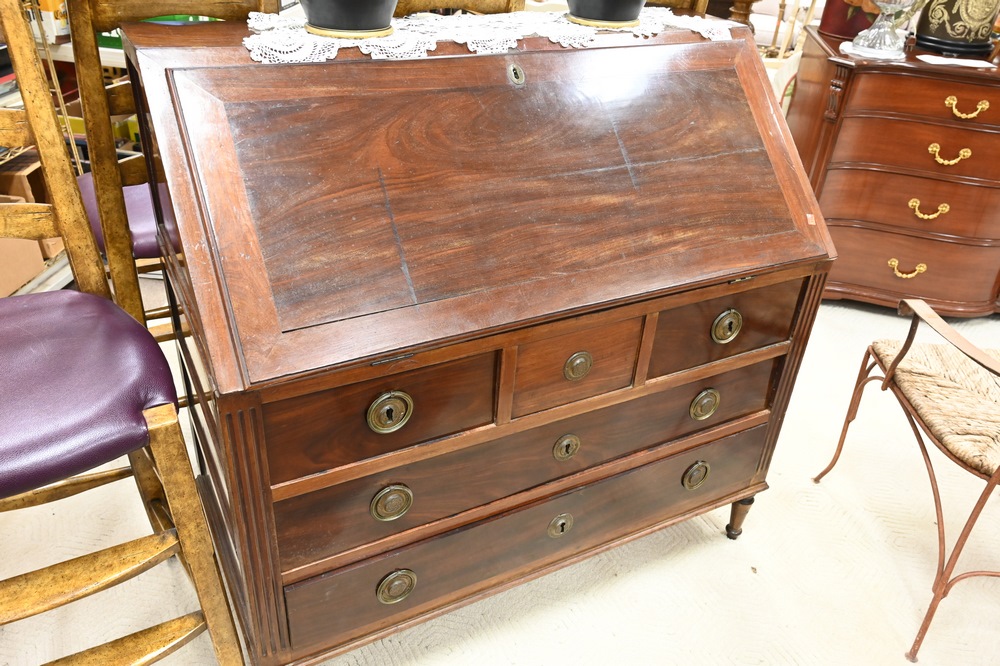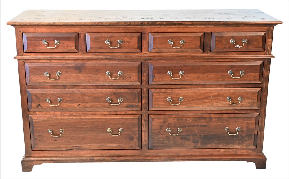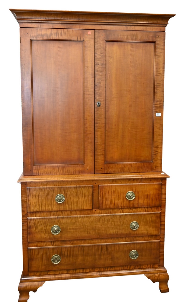 Leonard’s Custom Tiger Maple Two Part Cabinet, having two doors opening to shelves, on base with two over two drawers, height 81 inches, upper case width 41 inches.