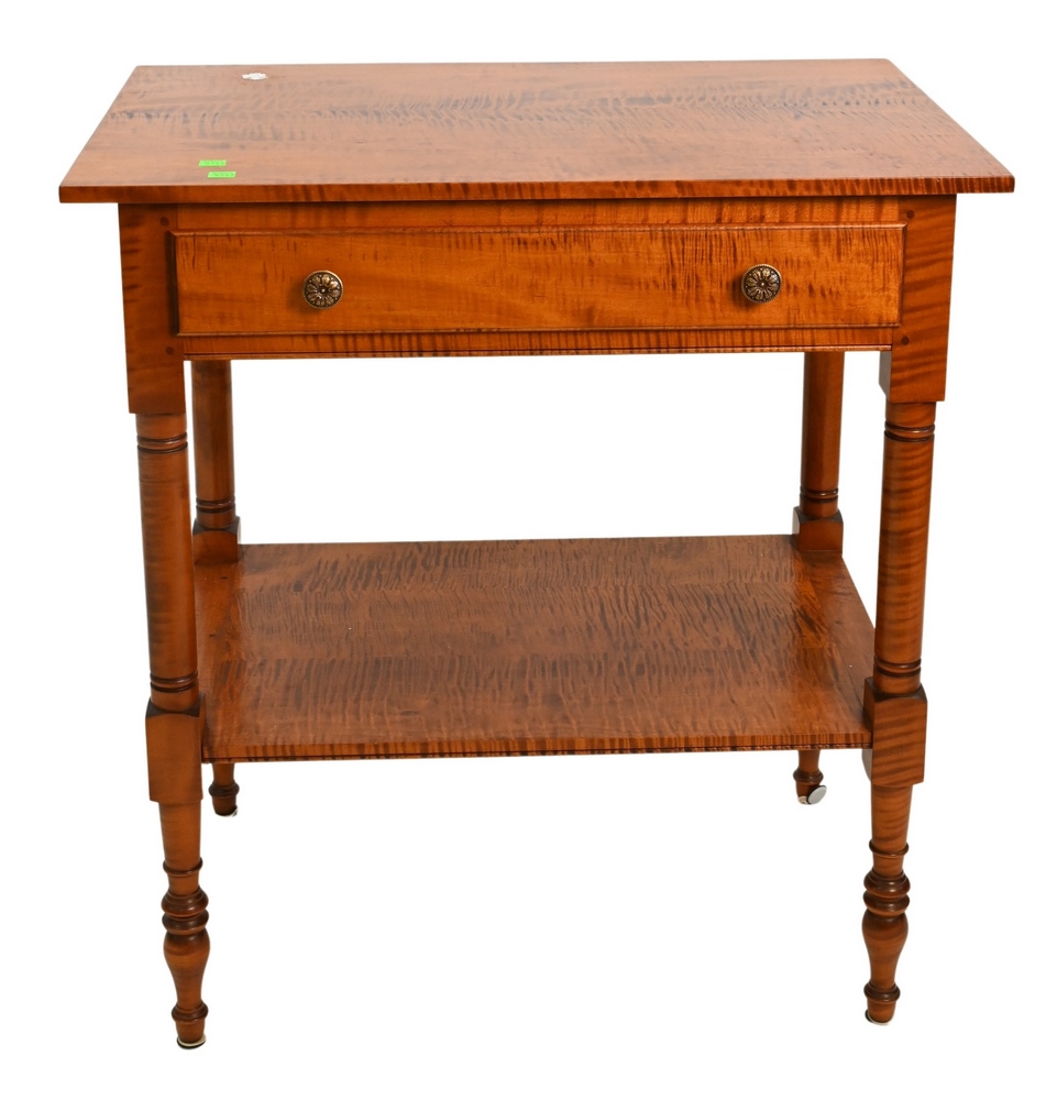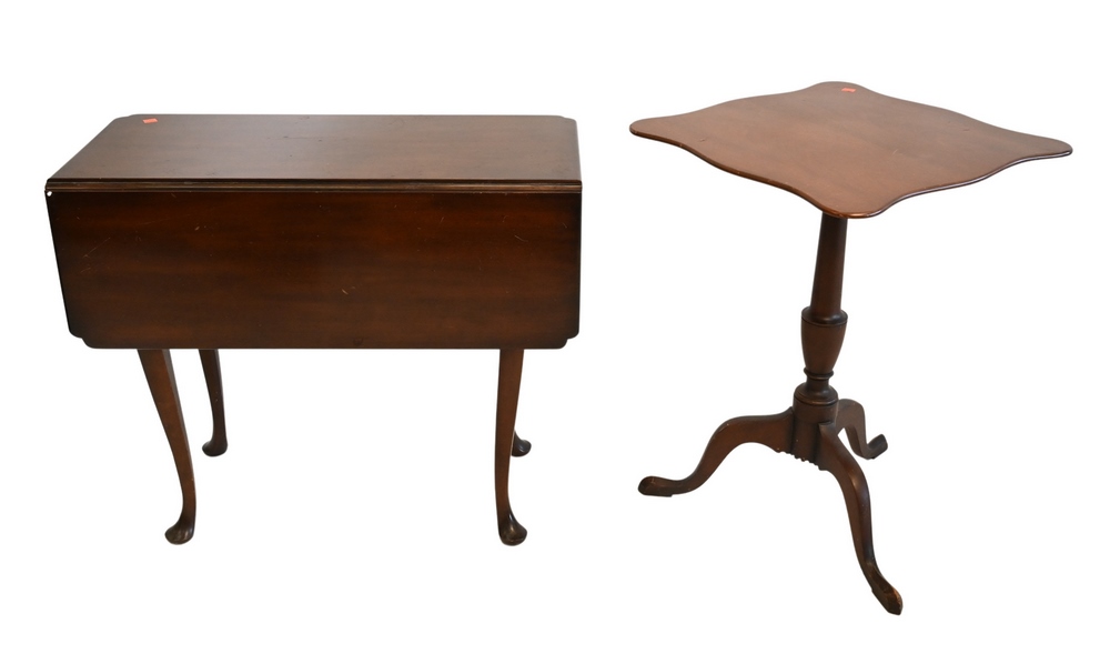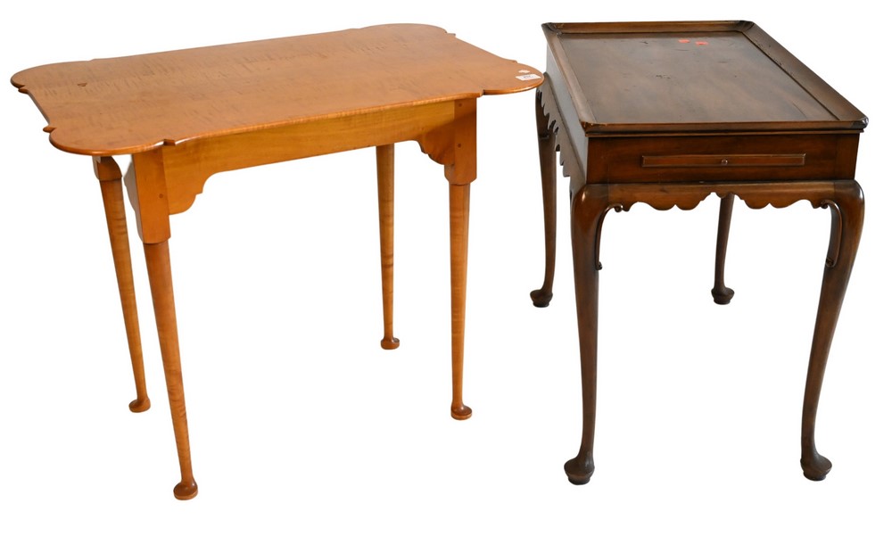 Two Piece Lot to include, Eldred Wheeler Tiger Maple Queen Anne Style Tea Table, having shaped top, height 27 inches, top 22 x 32 1/2 inches; along with a Kittinger Colonial Williamsburg Queen Anne style tea table (rough finish).