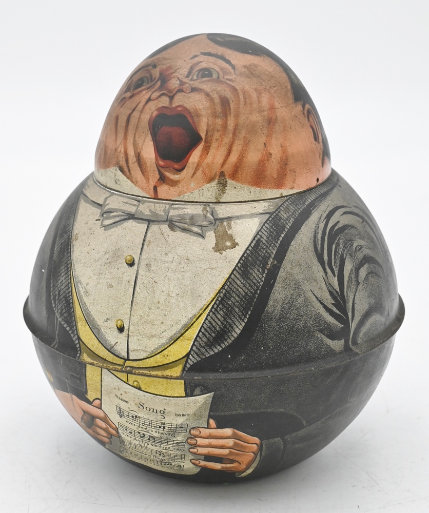 Roly Poly Brownie Tin Advertisement Jar, tobacco, opera man, late 20th century, height 7 inches, Provenance: Fifty Year Personal Collection of Clocks and American Antiques from Thomas Bailey, Manchester, Connecticut.