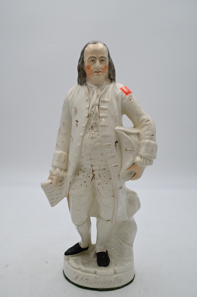 Victorian Staffordshire Figure, titled “Washington”, gilt and paint decorated standing figure, model holding tricorn hat under left arm, similarly modeled as depiction of Benjamin Franklin, height 15 1/2 inches.
