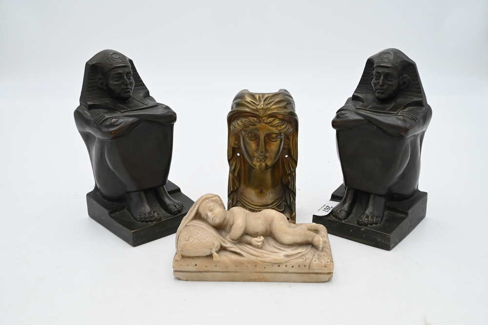 Four Piece Assorted Group, to include a pair of bronze pharaoh bookends; carved marble figure of a young child sleeping; along with a brass bust of a woman, height 6 3/4 inches.