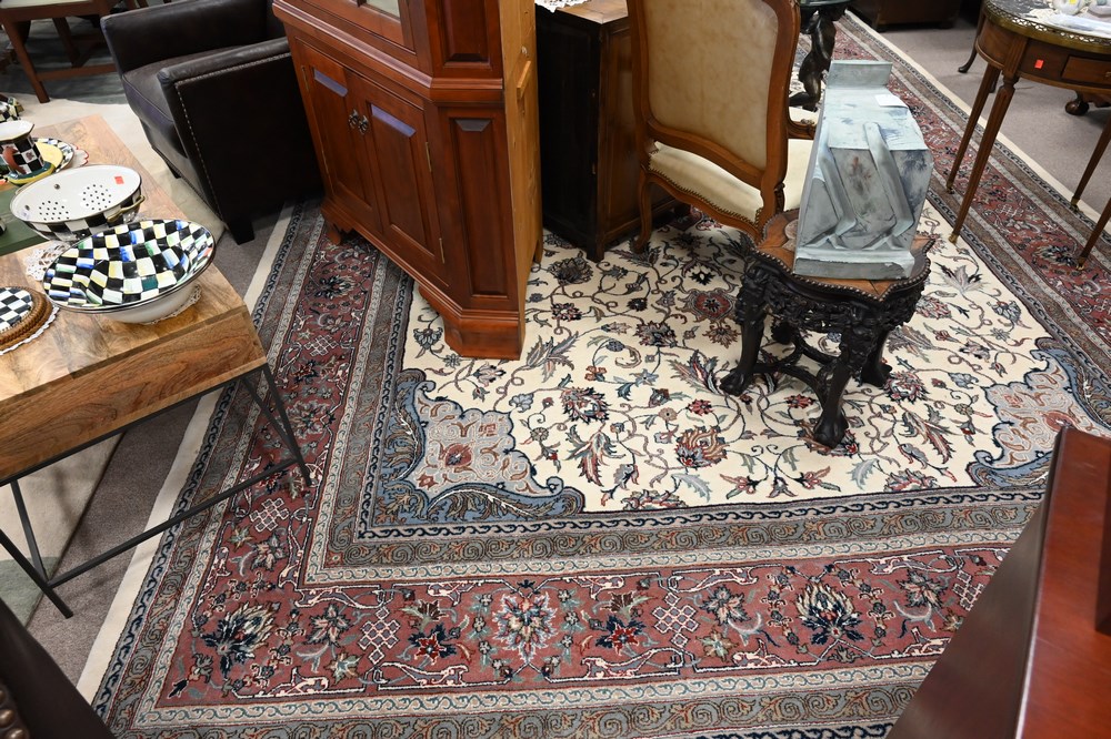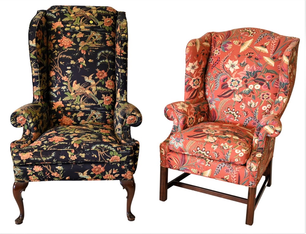 Pair of Chairs, to include Baker chippendale style upholstered wing chair, height 45 inches, width 33 inches, very clean condition; along with a Queen Anne style upholstered wing chair having Asian themed upholstery.