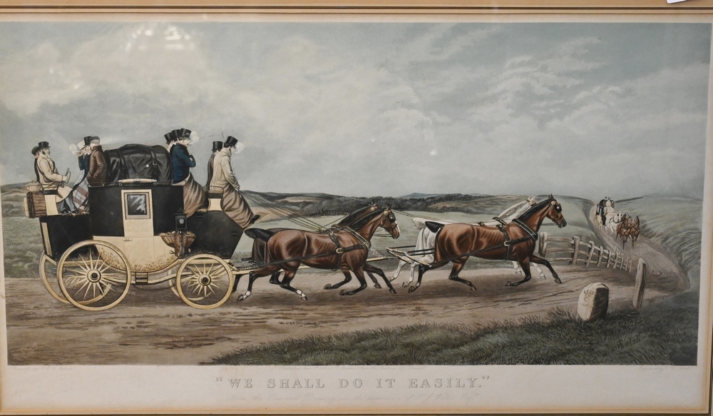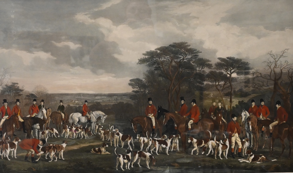 After Francis Grant (Scottish, 1803 – 1878), “Sir Richard Sutton and the Quorn Hounds”, lithograph in colors on paper, inscribed in plate throughout the lower margin, image size 20 1/2 x 35 inches.