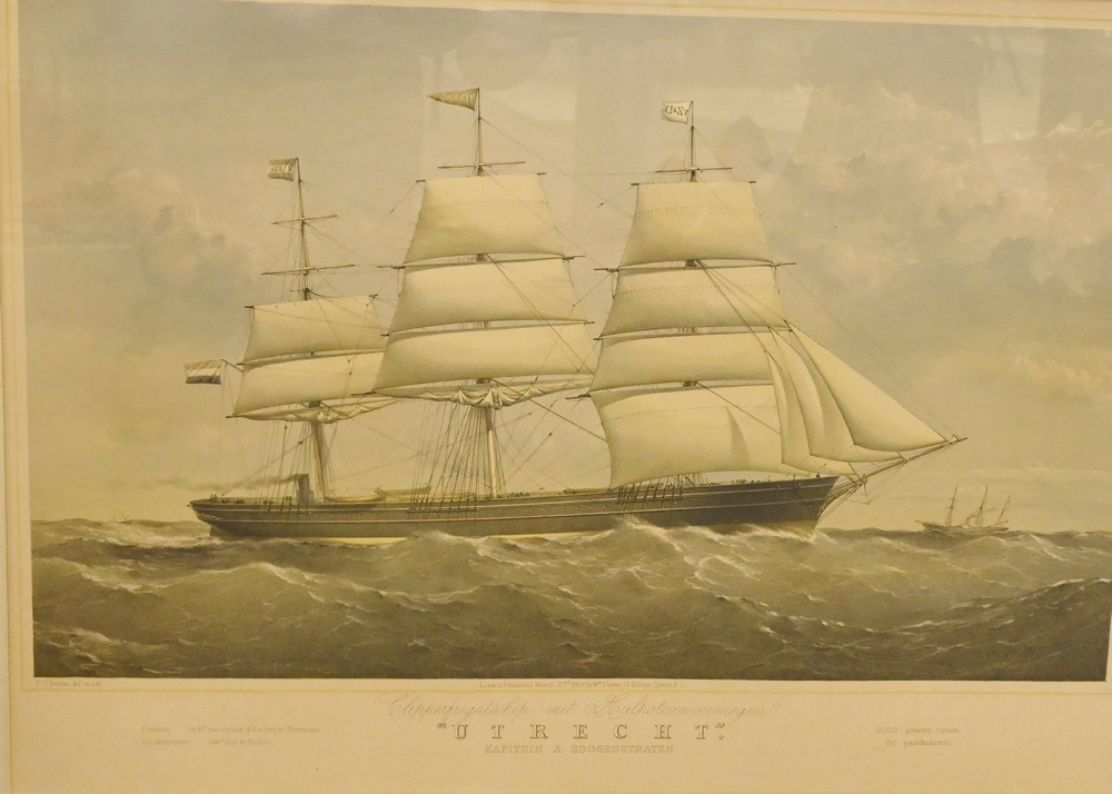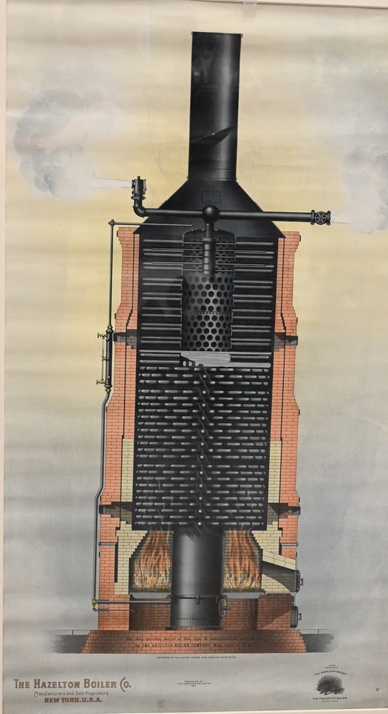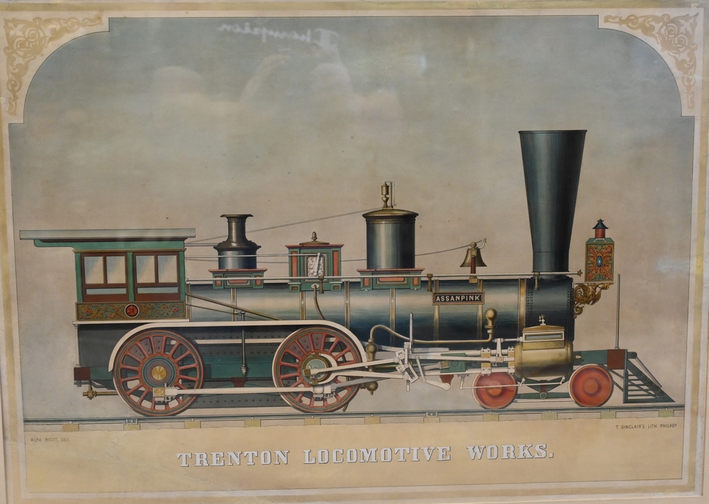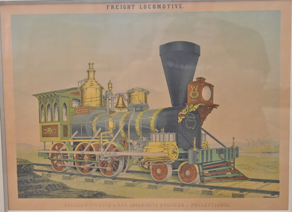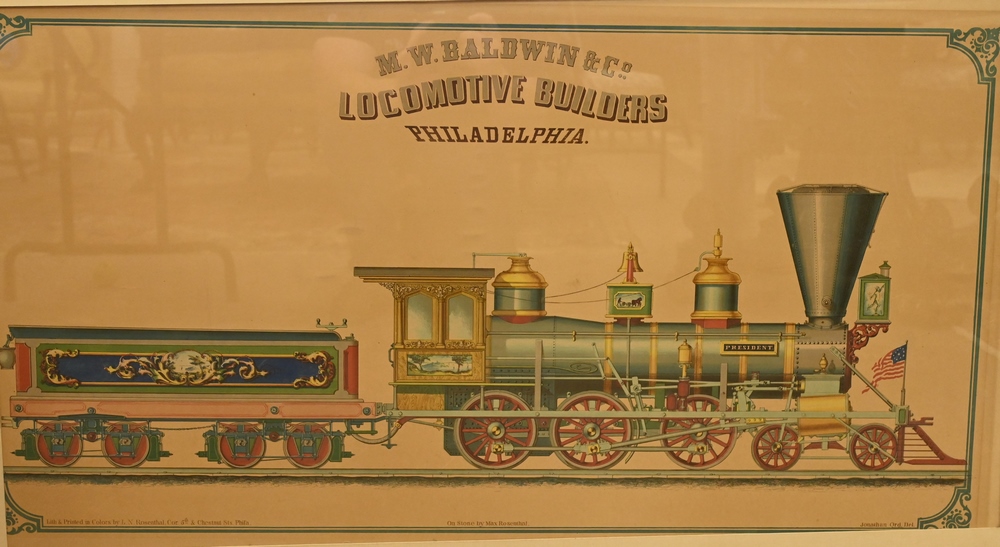 M.W. Baldwin and Company Locomotive Builders, Philadelphia, name of locomotive “President”, lithograph and prints on stone by Max Rosenthal, frame size 29 x 46 inches, paper size 20 3/4 x 38 inches.