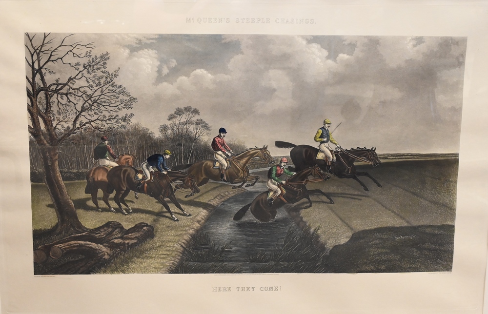 Two Piece Lot, to include Charles Hunt & Sons hunt scenes “Greensleeves Leads the Way (McQueen’s Steeple Chasings), 1873”; along with “Here They Come (McQueen’s Steeple Chasings), 1873”, both engravings having hand coloring on paper, both inscribed in plate along the lower margin, image size 17 x 30 inches.