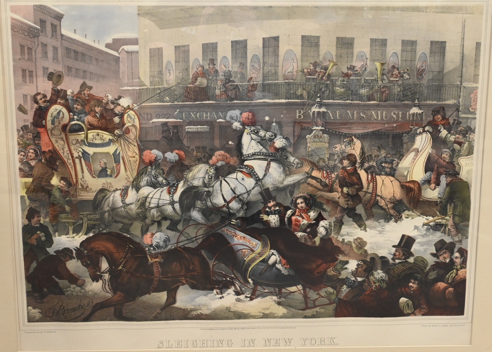 Thomas Benecke (1850 – 1860), Sleighing in New York, original hand colored lithograph, winter scene on Broadway in front of Barnum’s Museum, depicting a snowball fight, paper size 28 x 37 inches, frame size 34 x 43 inches.