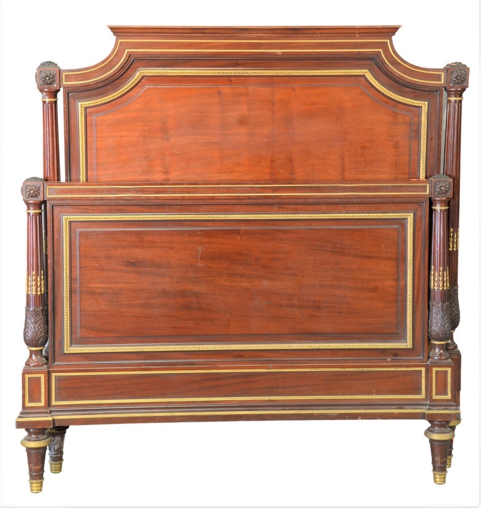 H. Fourdinois Louis XV Style Mahogany Bed, having gilt bronze mounts, twin size, signed H. Fourdinois, European size, height 47 1/2 inches, width 44 1/2 inches.