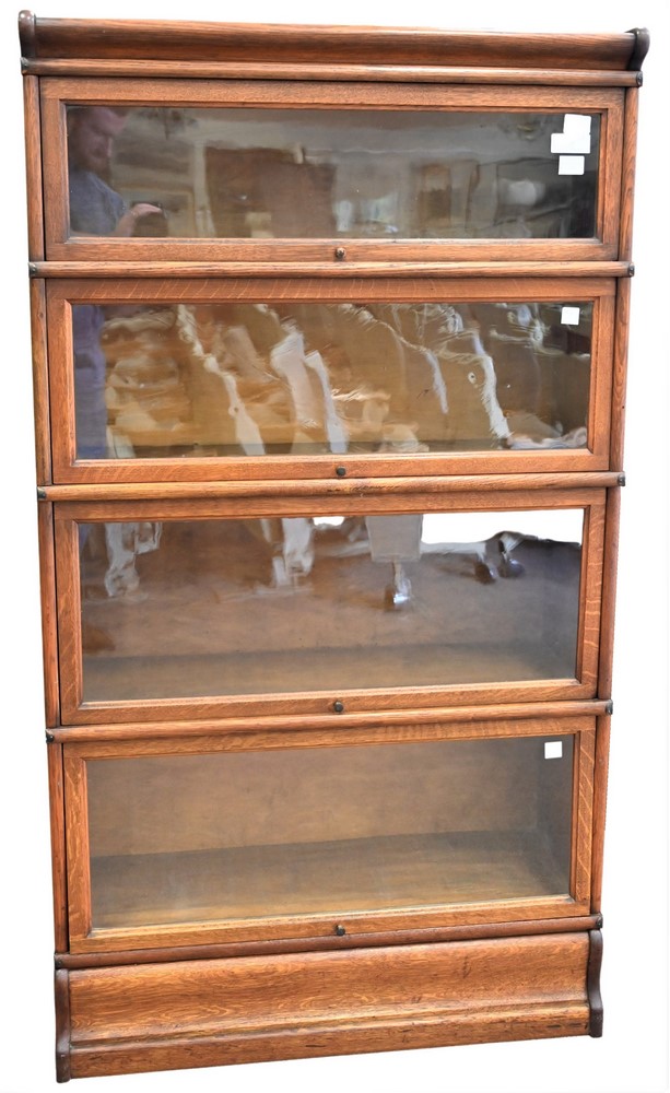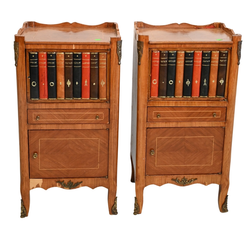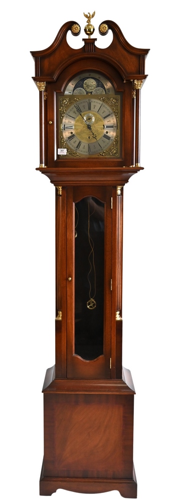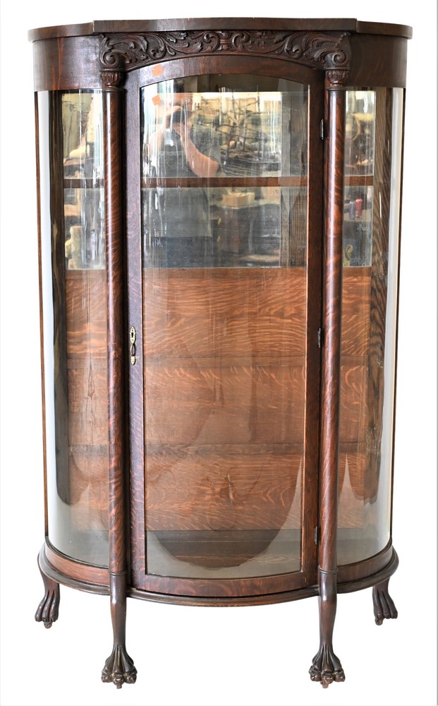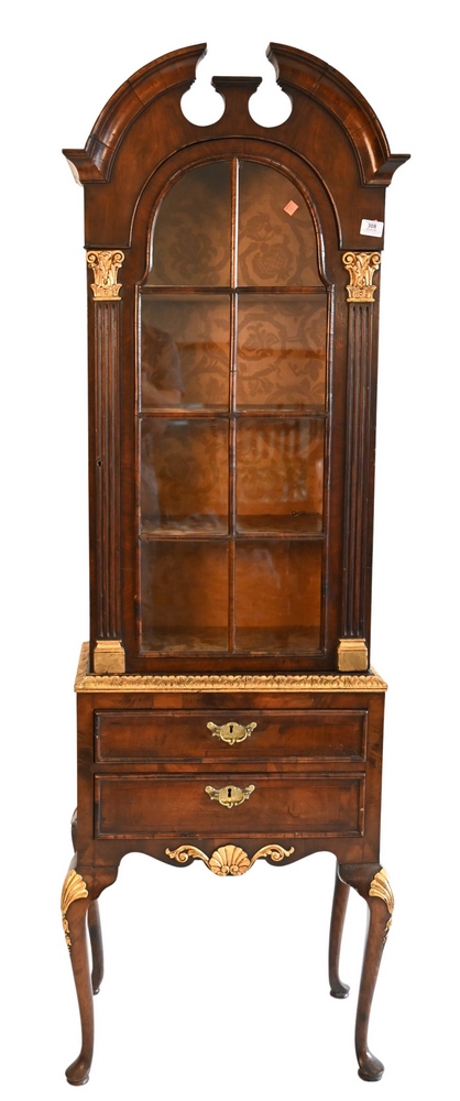 Queen Anne Style Two-Part Burlwood Cabinet, having broken arch over large glass door set on base with two drawers, height 74 inches, width 22 1/2 inches.