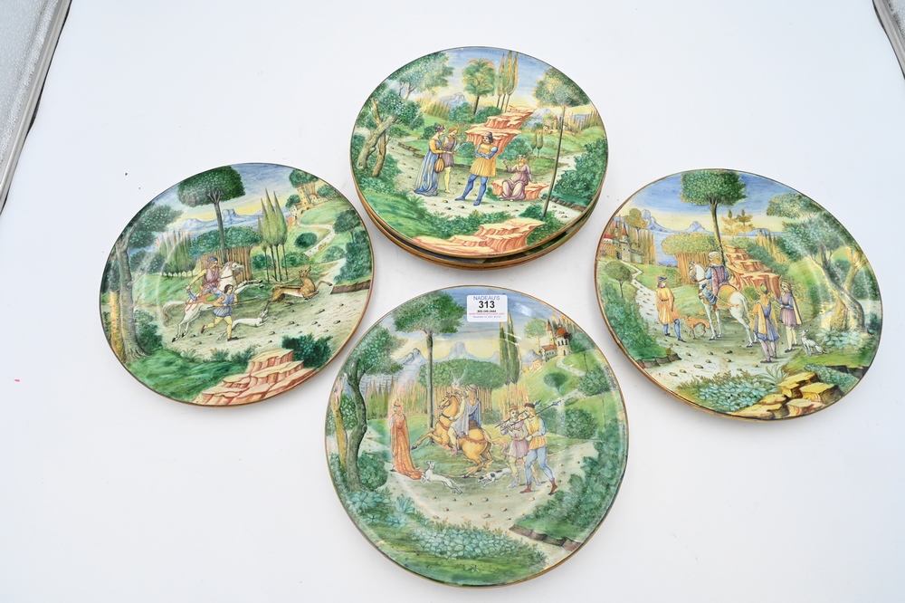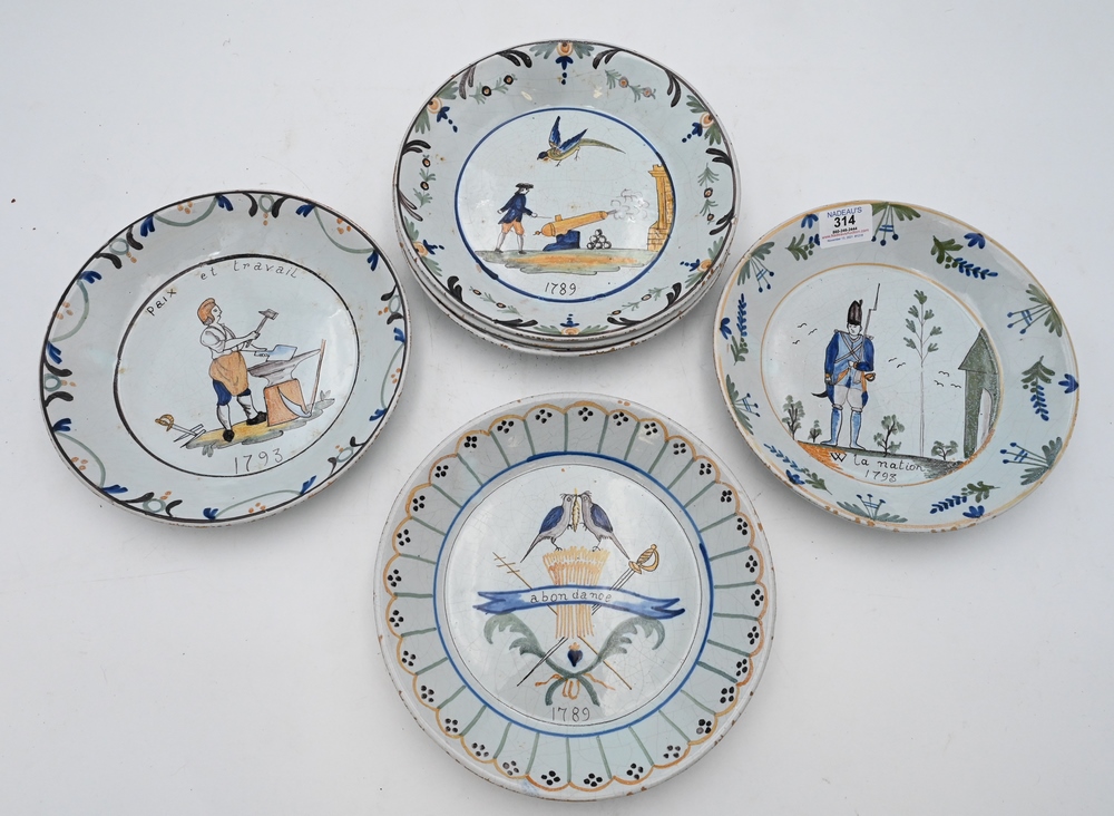 Set of Six French Faience Plates, having different painted scenes, to include winged figure and tombstone “Pagon”; “Jeanne Charbonnier, 1789”; soldier with cannon and bird, 1789 “Abondance 1789”; “Paix et Travail, 1793”; along with “La Nation, 1793”; diameter 9 inches.