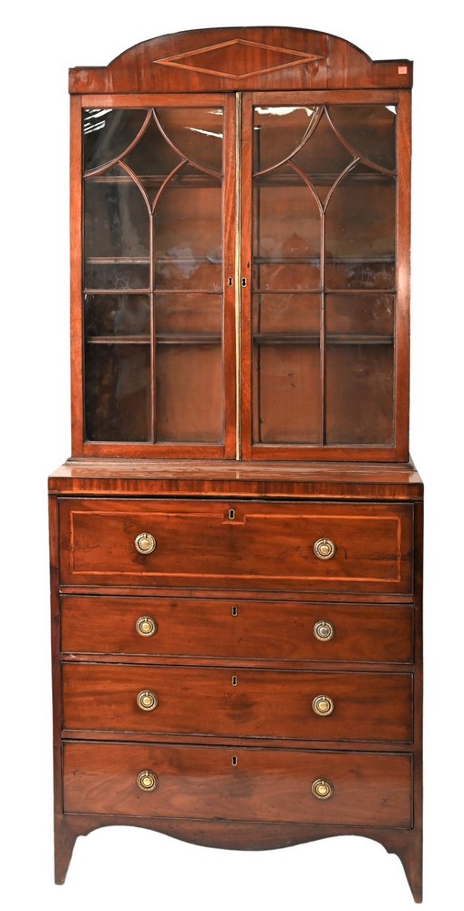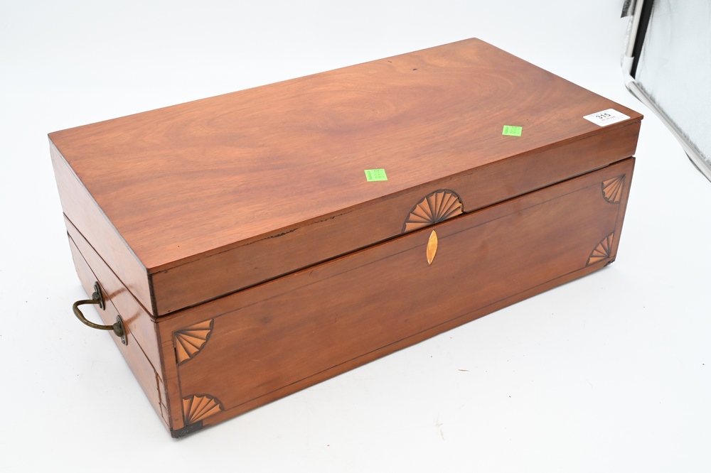 Mahogany Lap Desk, having fan inlays, old script handwriting on inside “Russell Loomis, Bolton, Conn., Edward ____, New London County”, 10 x 19 1/2 inches, Provenance: Fifty Year Personal Collection of Clocks and American Antiques from Thomas Bailey, Manchester, Connecticut.
