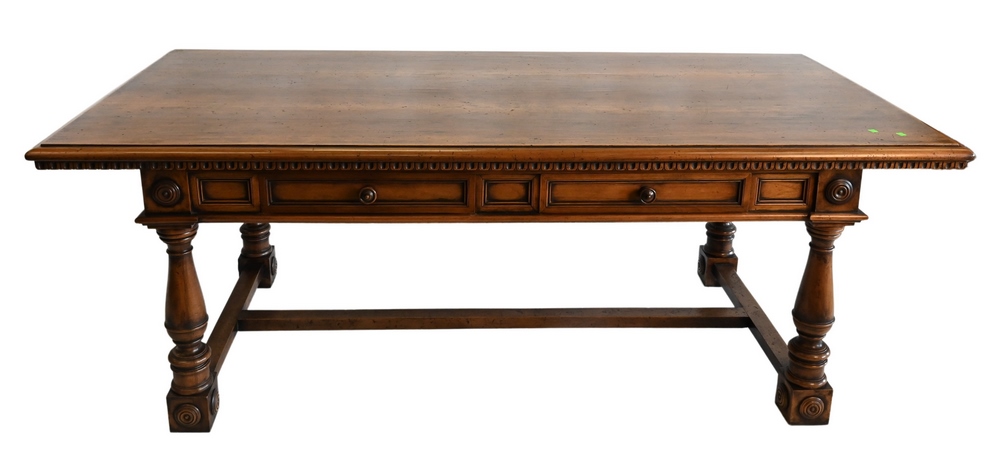 Round Mahogany Table on Single Pedestal Base, having center star inlay, (water stains on top), height 30 inches, diameter 64 inches; separate surrounding leaves, 12 inches each, chips on edge of one leaf; open diameter 88 inches; along with custom pads.