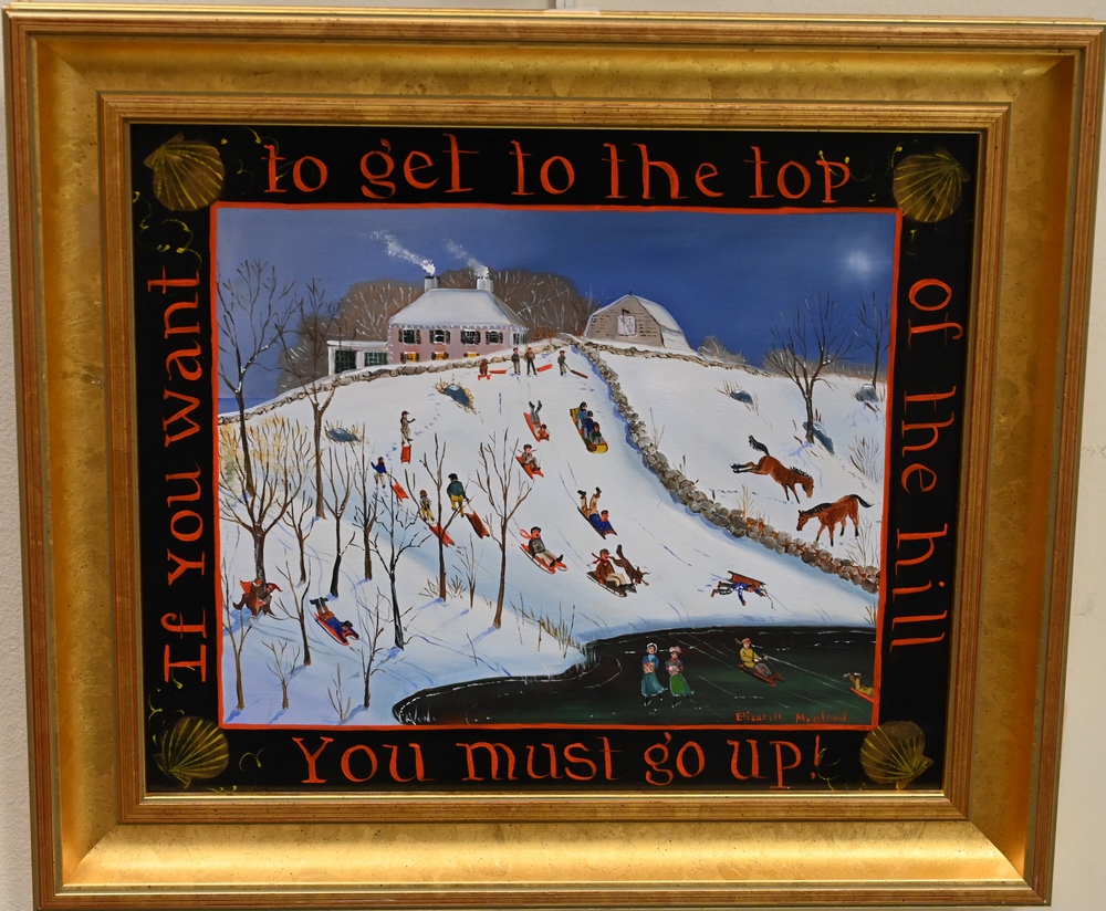 Elizabeth Mumford (1950 – 2020), winter landscape, sledding, oil on board, “If you want to get to the top of the hill you must go up.”, 9 1/2 x 11 1/2 inches.