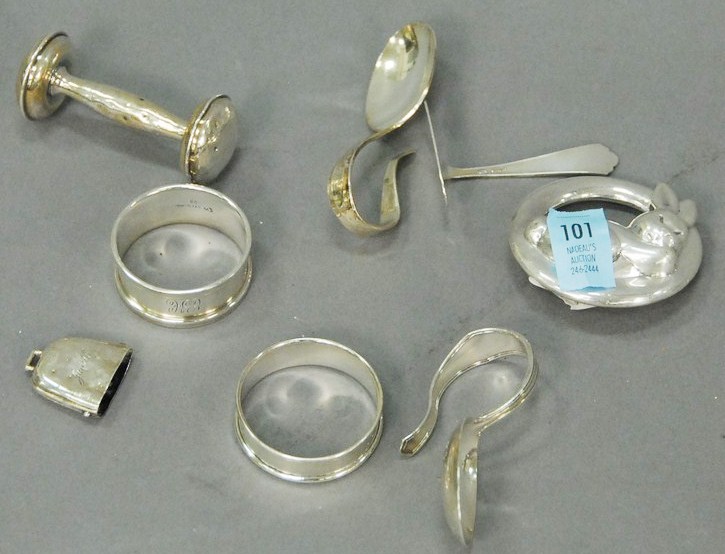 Group lot of sterling silver children’s spoons, rattles, and two napkin rings, 4.6 t oz. Provenance: Estate of Judy Gengras McDonough of West Hartford, CT.