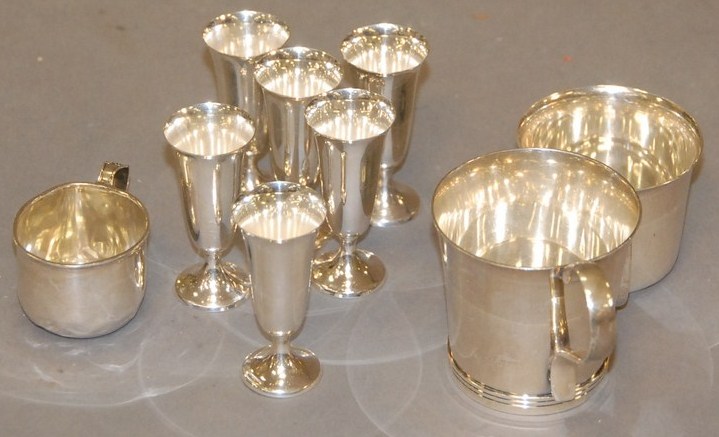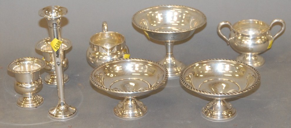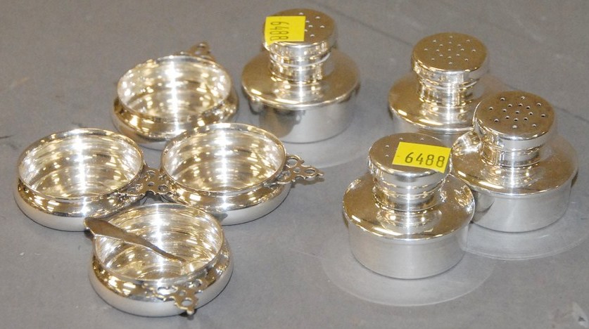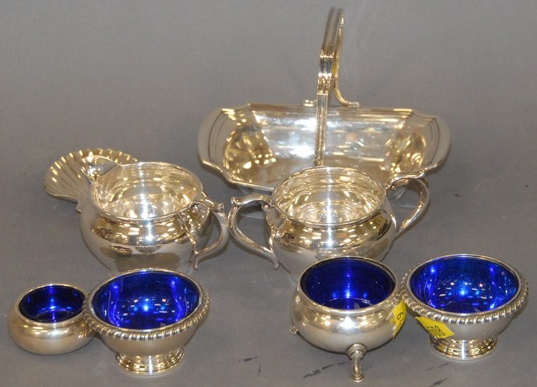 Group lot of sterling silver salts, open salts, small basket, sugar, and creamer, 11.9 t oz. plus one salt. Provenance: Estate of Judy Gengras McDonough of West Hartford, CT.