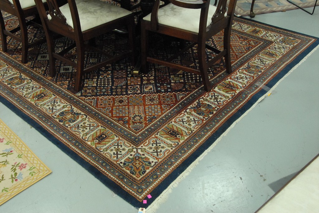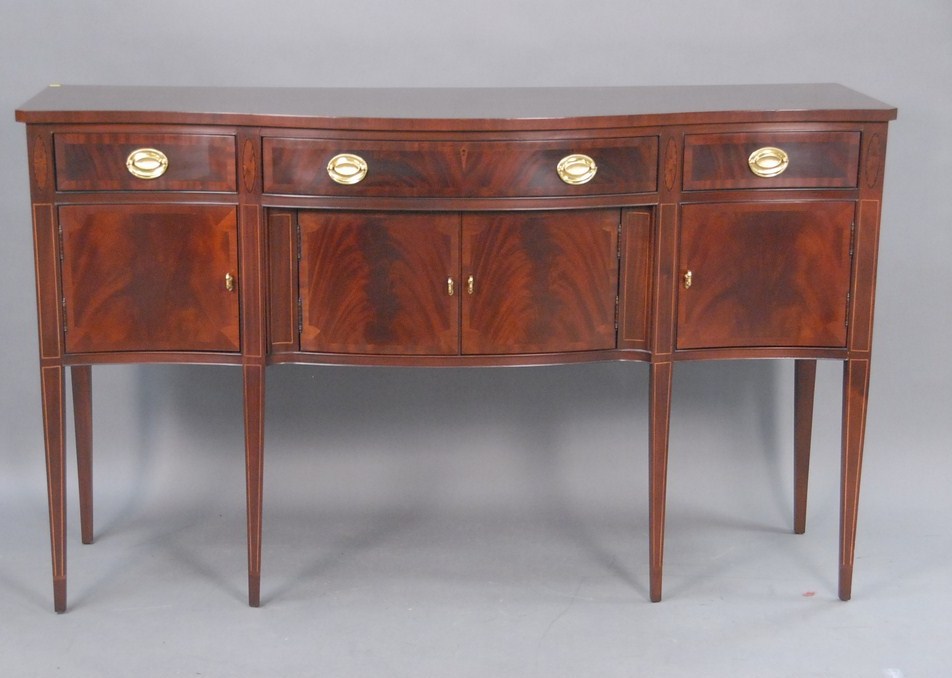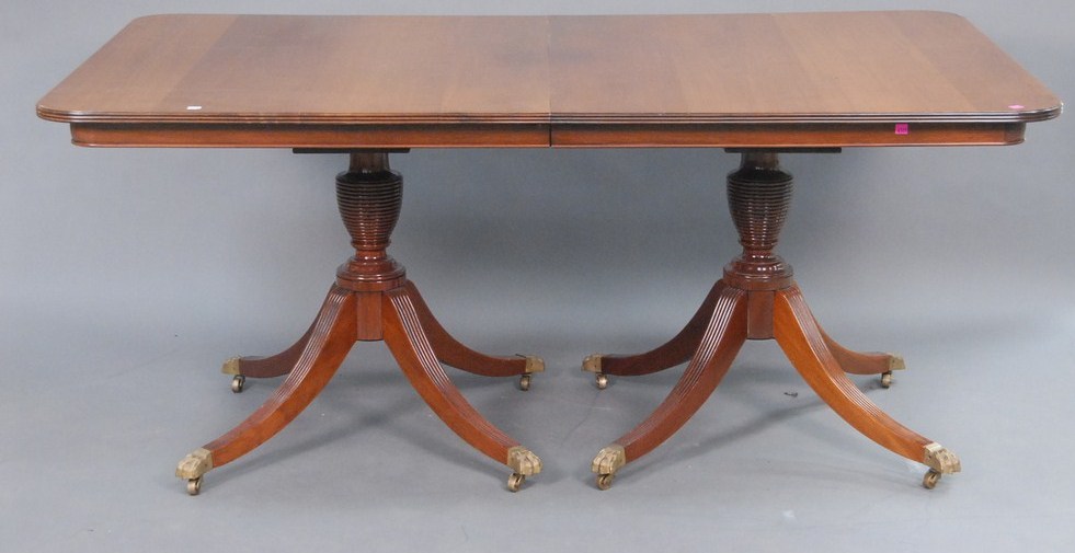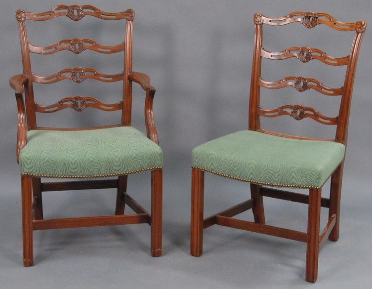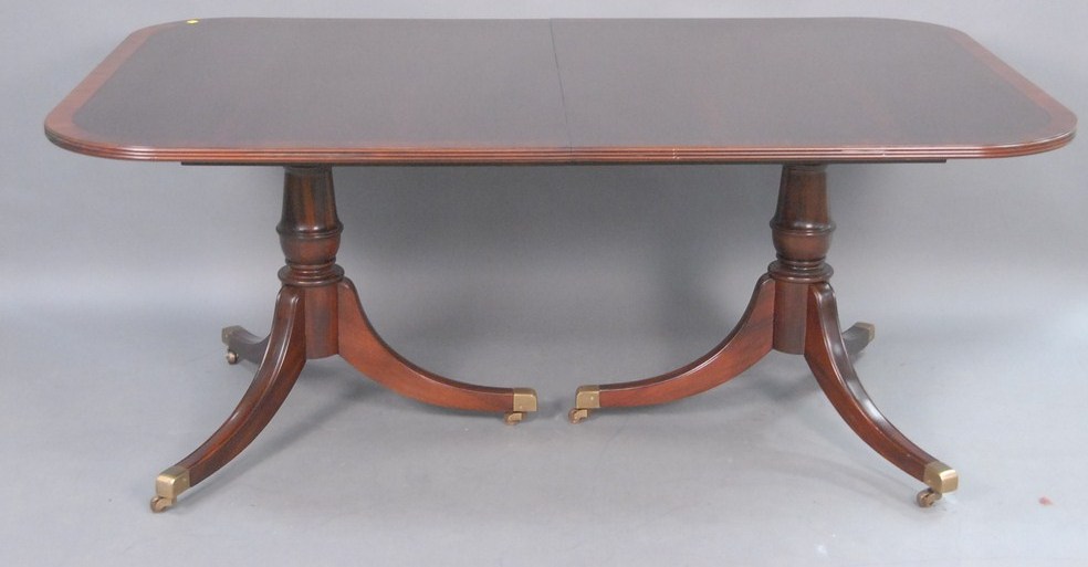 Hickory dining set eight mahogany Chippendale style dining chairs and banded inlaid edged double pedestal dining table with two leaves and custom pads, table: 72in. plus two 22in. leaves opening to a total length 116in.