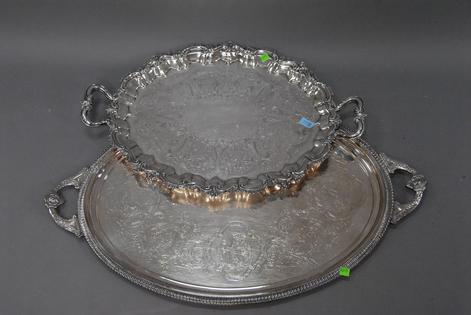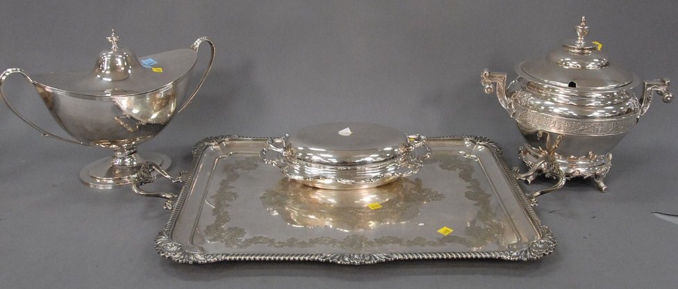 Four piece lot of silverplate two covered tureens, covered vegetable dish, and large tray. Provenance: Estate of Judy Gengras McDonough of West Hartford, CT.