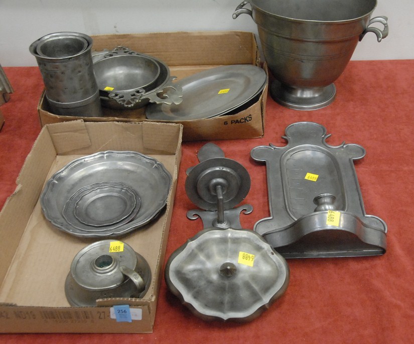 Pewter lot candle holders, candle sconces, plates, measures, porringers, and ice bucket. Provenance: Estate of Judy Gengras McDonough of West Hartford, CT.