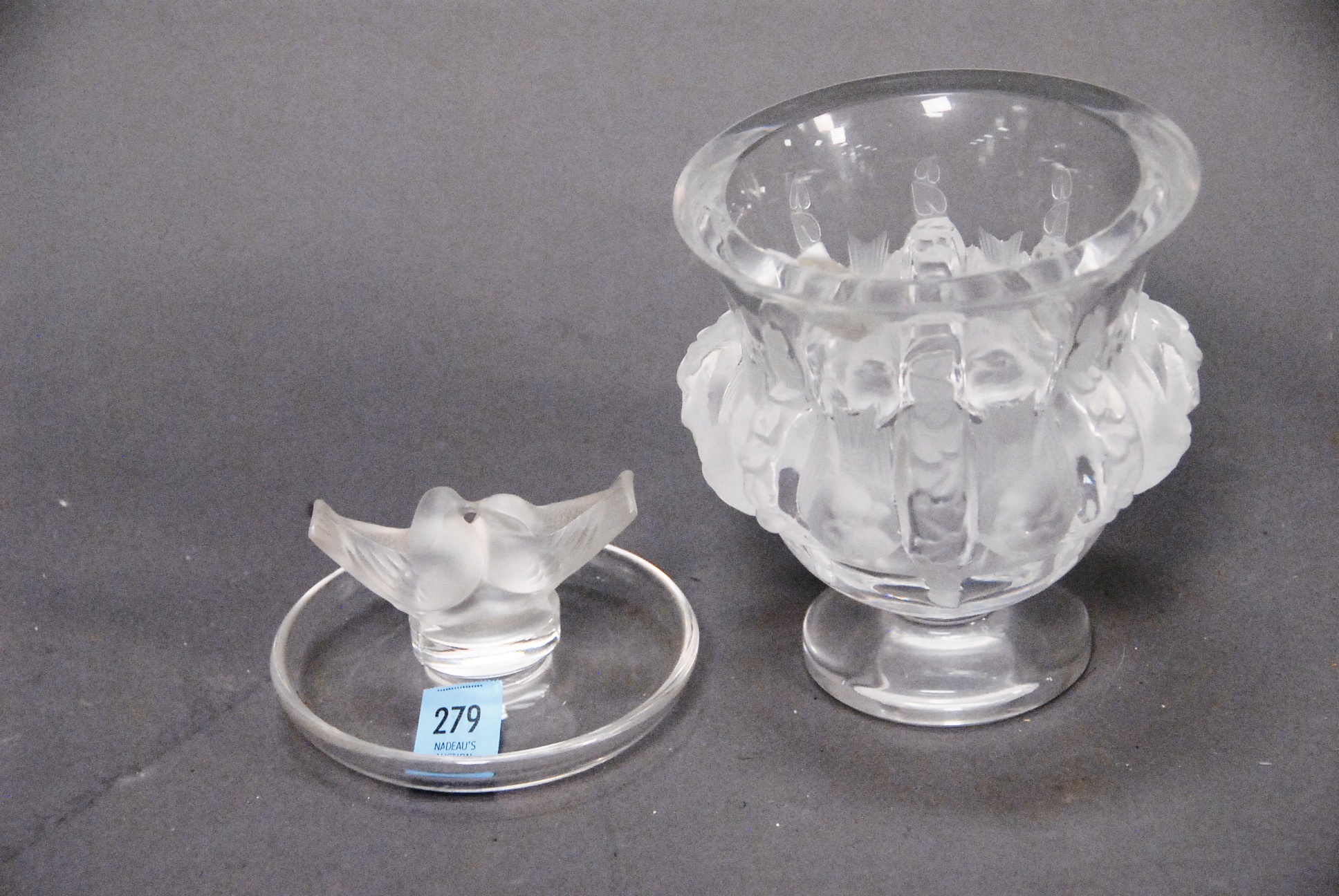 Two pieces of Lalique cigarette with frosted birds and small ring holder with frosted birds. Provenance: Estate of Judy Gengras McDonough of West Hartford, CT.