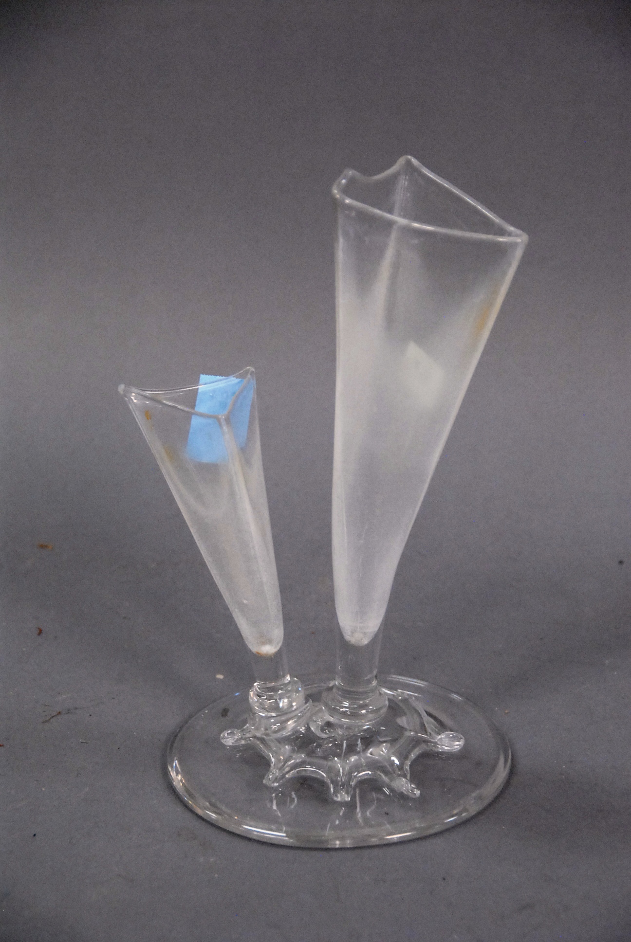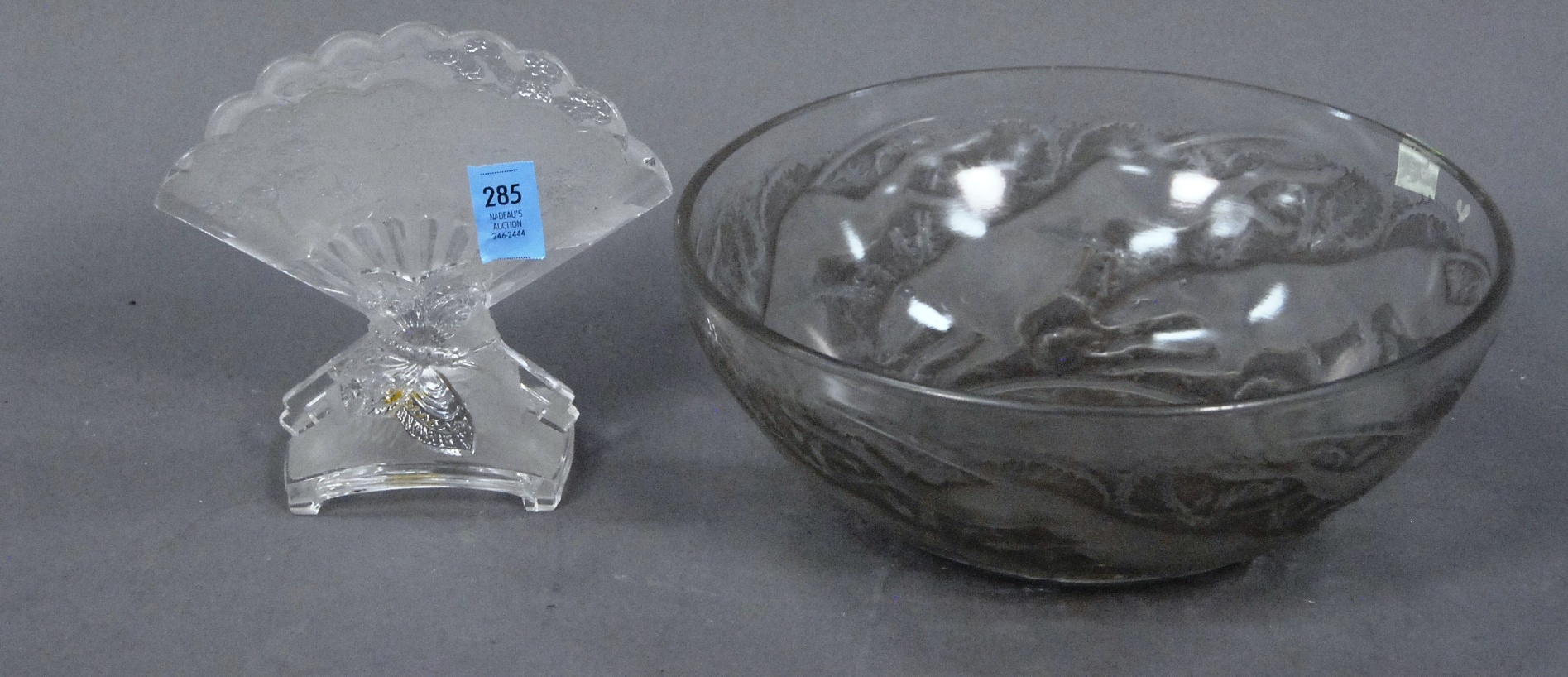 Two piece lot signed Baccarat crystal fan style vase with butterflies and frosted decoration ht. 5 1/2in. and a bowl having frosted dogs marked France on inside, dia. 9 1/2in.