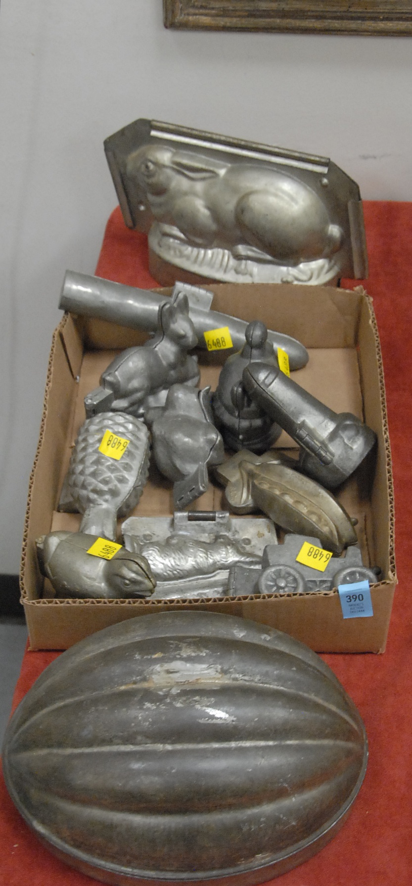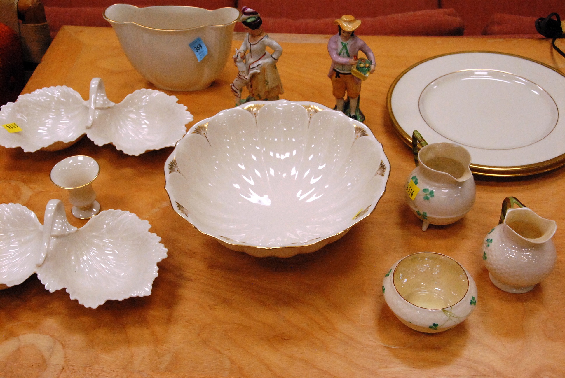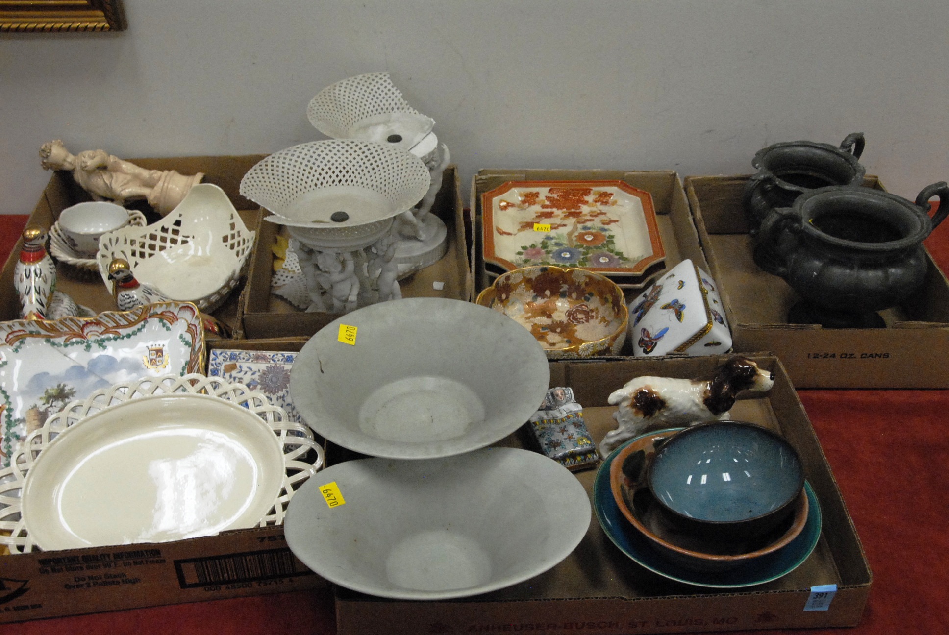 Six box lots creamware, Staffordshire birds, bowls, Royal Doulton dog, small lift top box, Oriental bowl, two Oriental plates, two pewter serving pieces, etc.