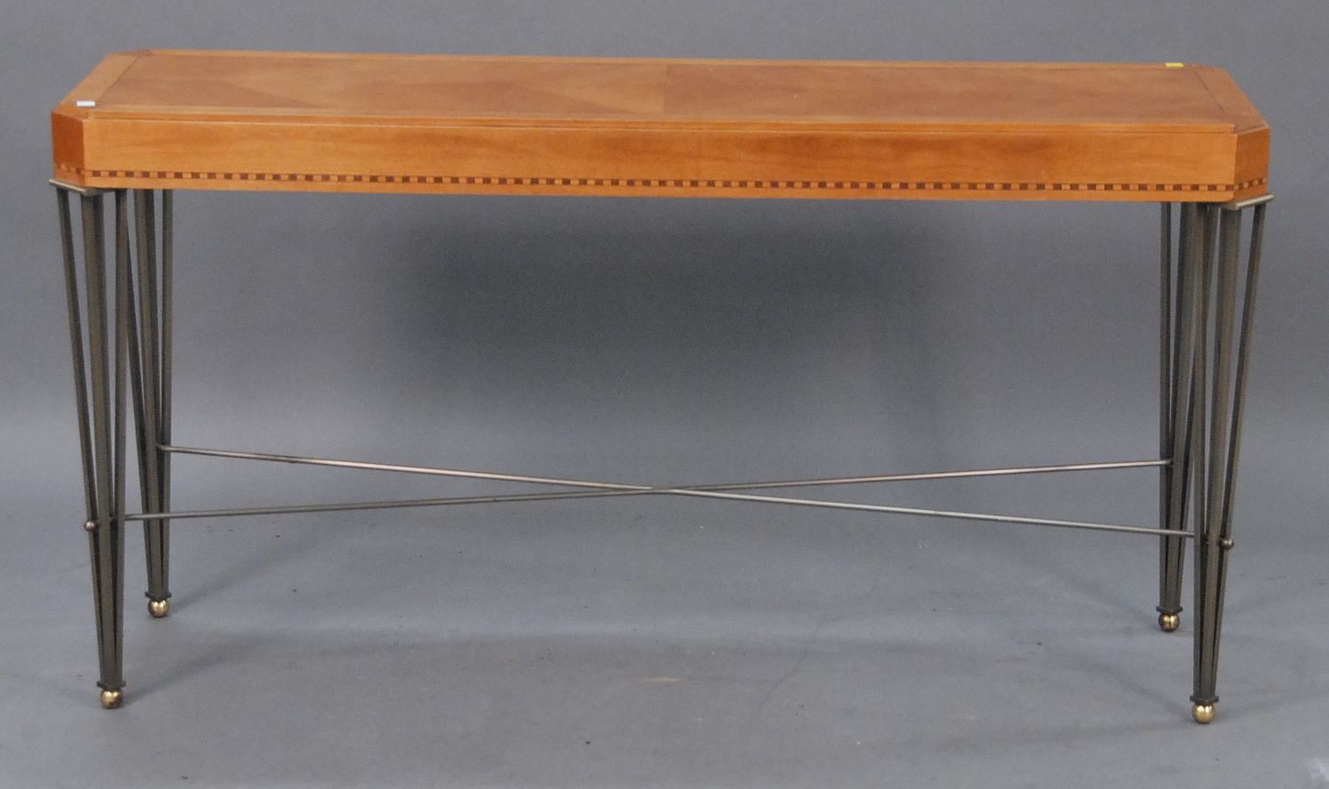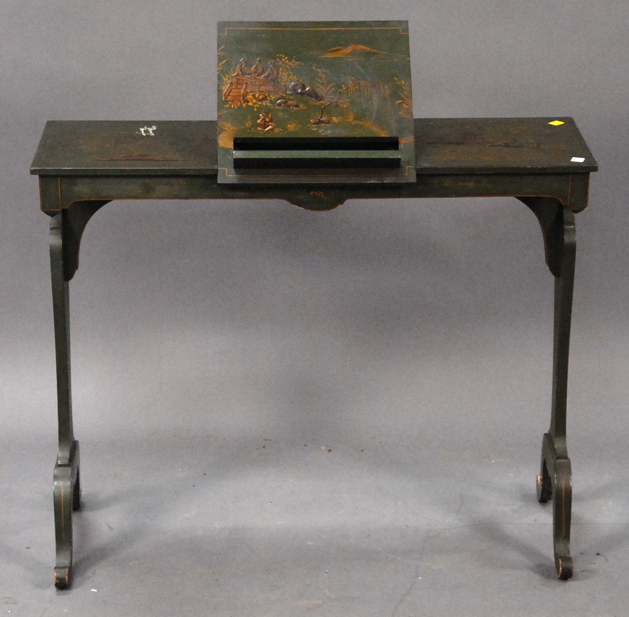Chinoiserie decorated green book stand, ht. 28in. lg. 34in. Provenance: property from a home in Rockville Center, New York which was decorated by Iris Apfel.