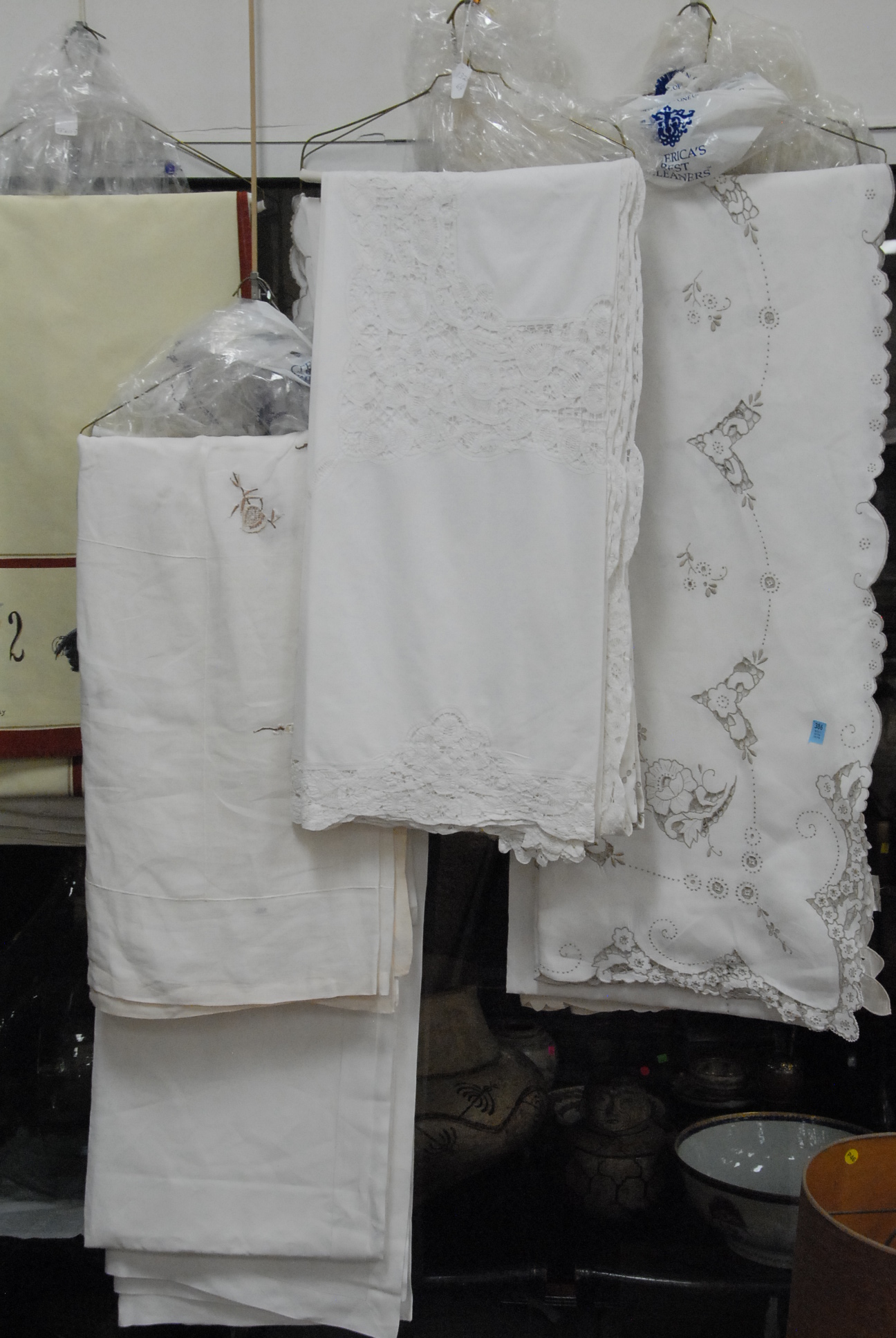 Group of eight tablecloths approximately 136 x 84, 132 x 64, 86 x 102, 184 x 64, 72 x 192, 58 x 104 etc. Provenance: Estate of Judy Gengras McDonough of West Hartford, CT.